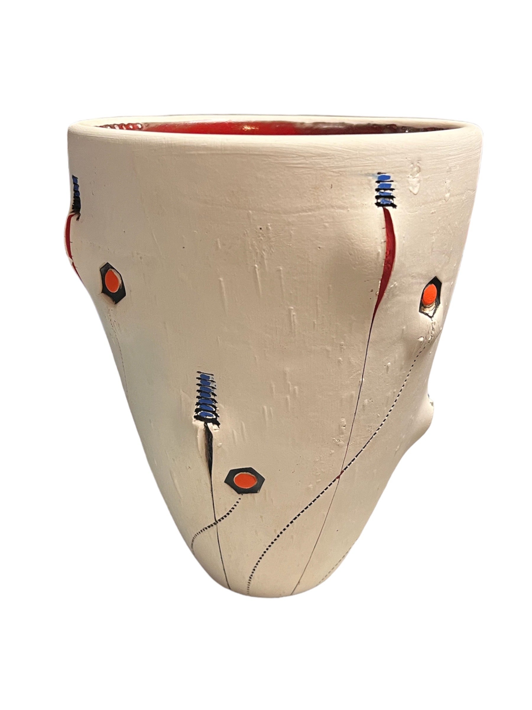 This stunning vase is handmade by famous South African artist Andile Dyalvane. Born in 1978 in the small village of Ngobozana, many of his works draw inspiration from his Xhosa heritage. This particular vase represents the scarification rituals practiced by the Xhosa people. Treating clay like skin, Dyalvane marks the surfaces of this collection with delicate patterns, celebrating the beauty of this youth.