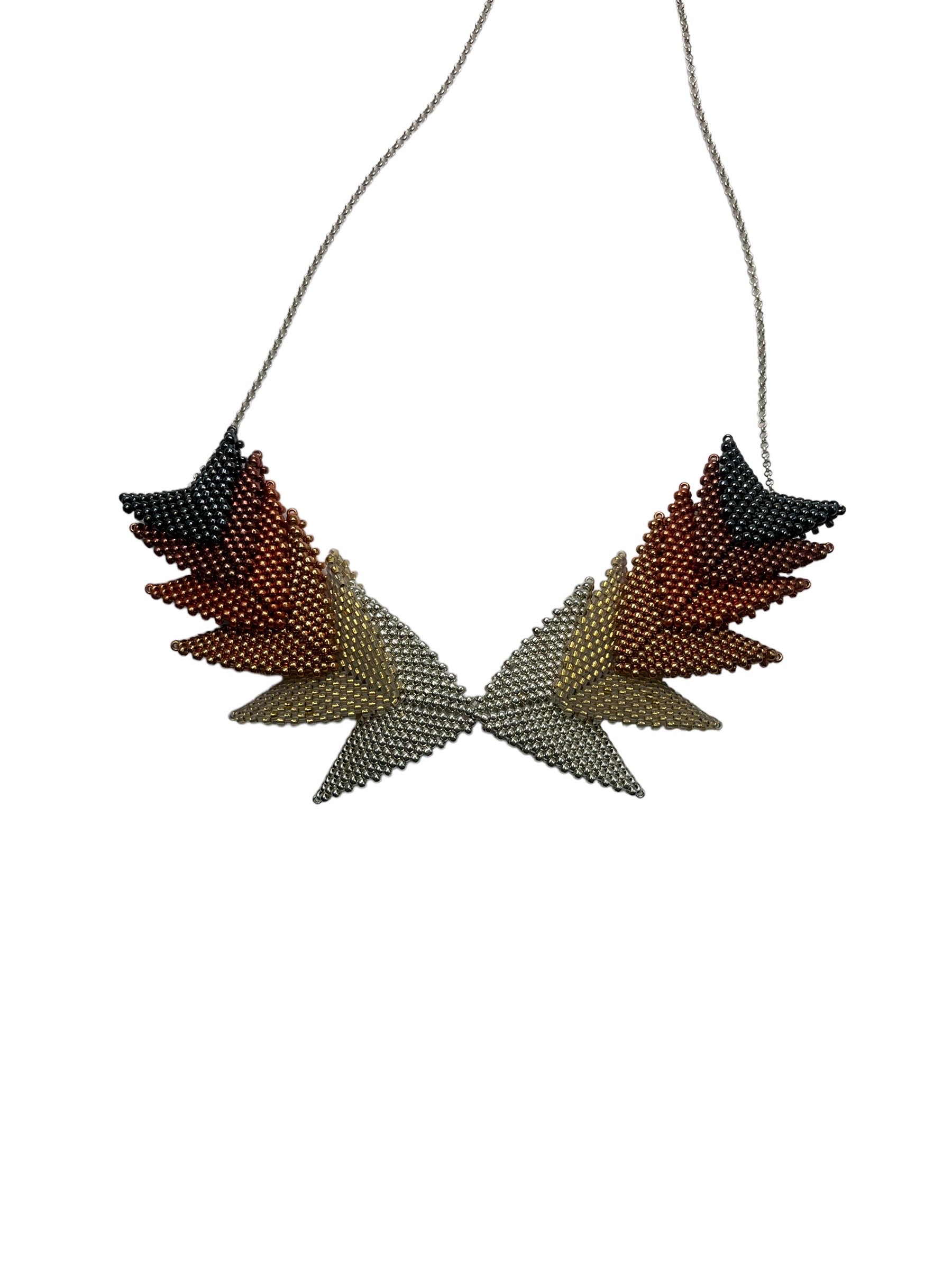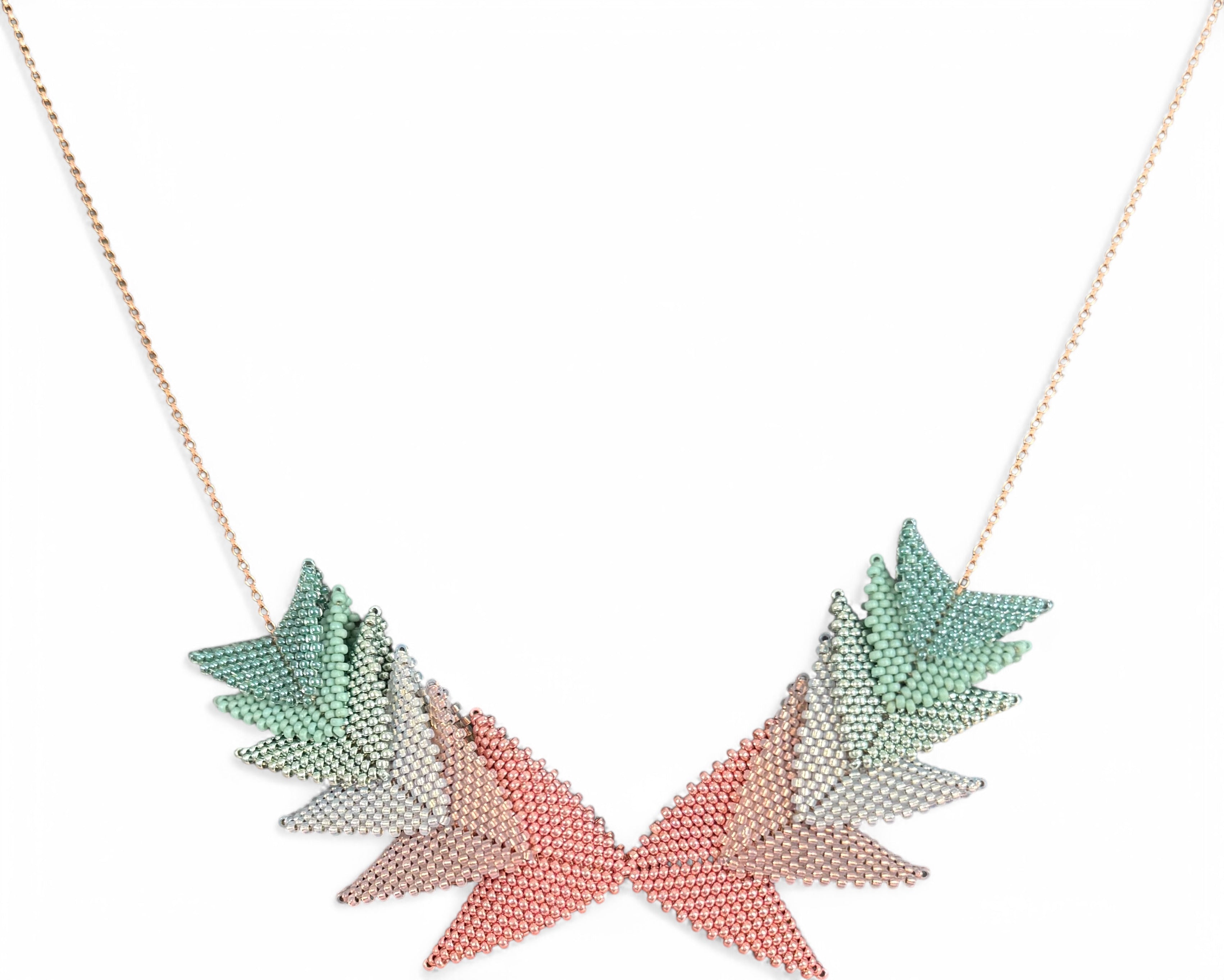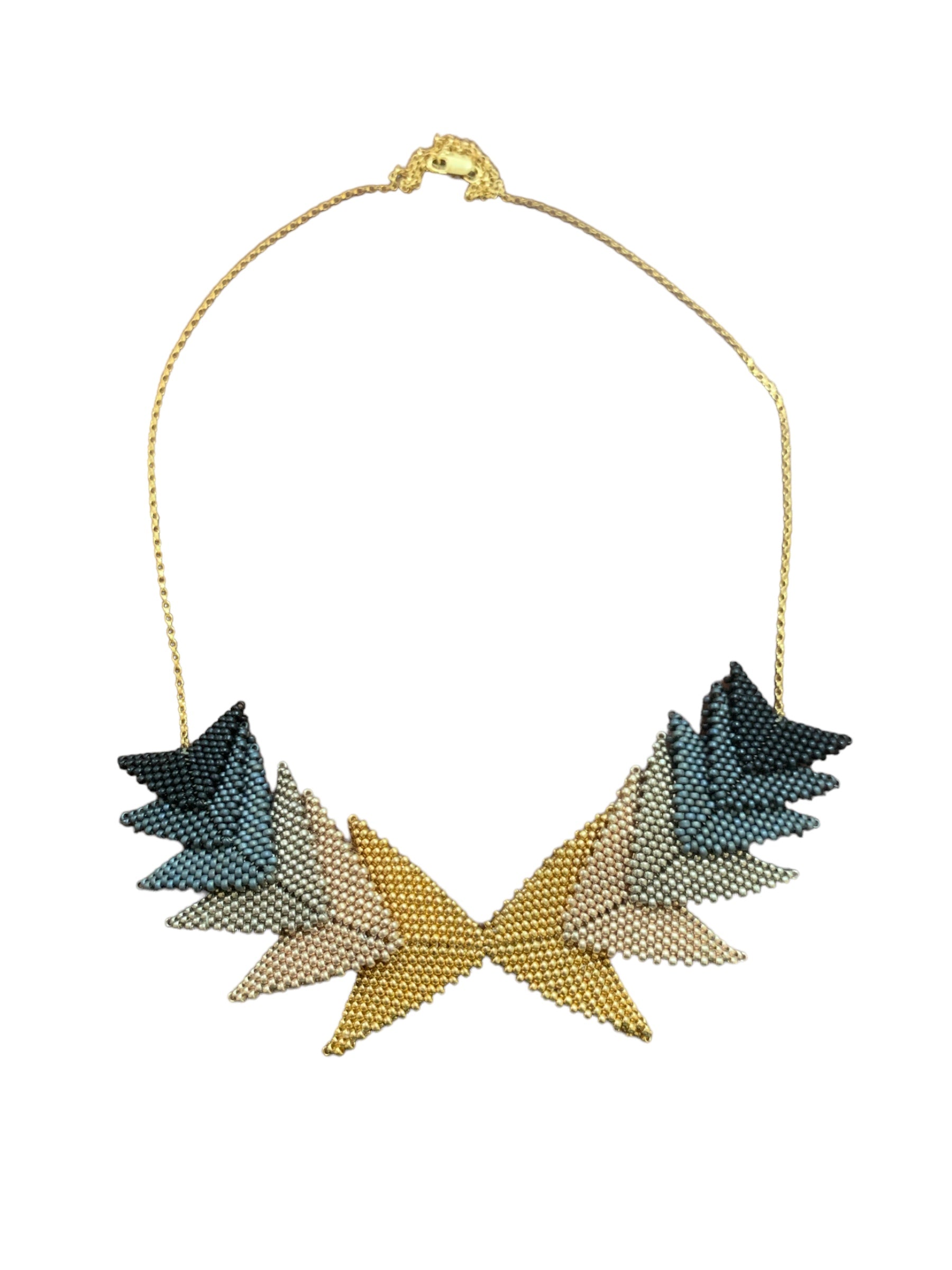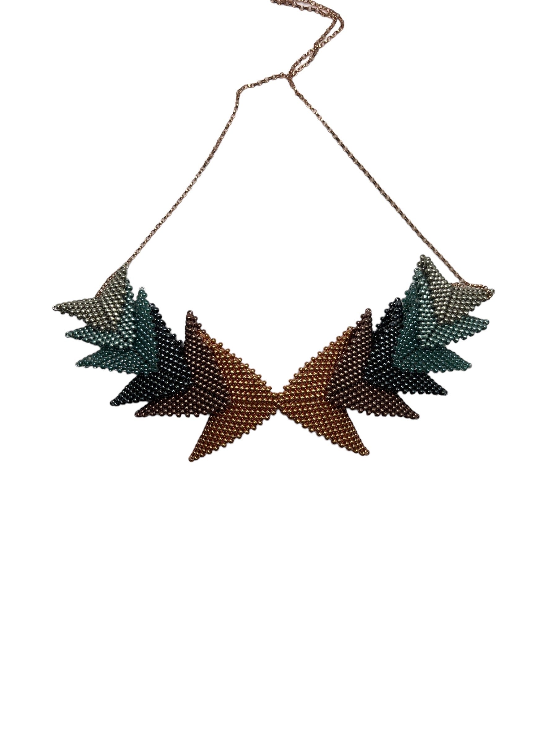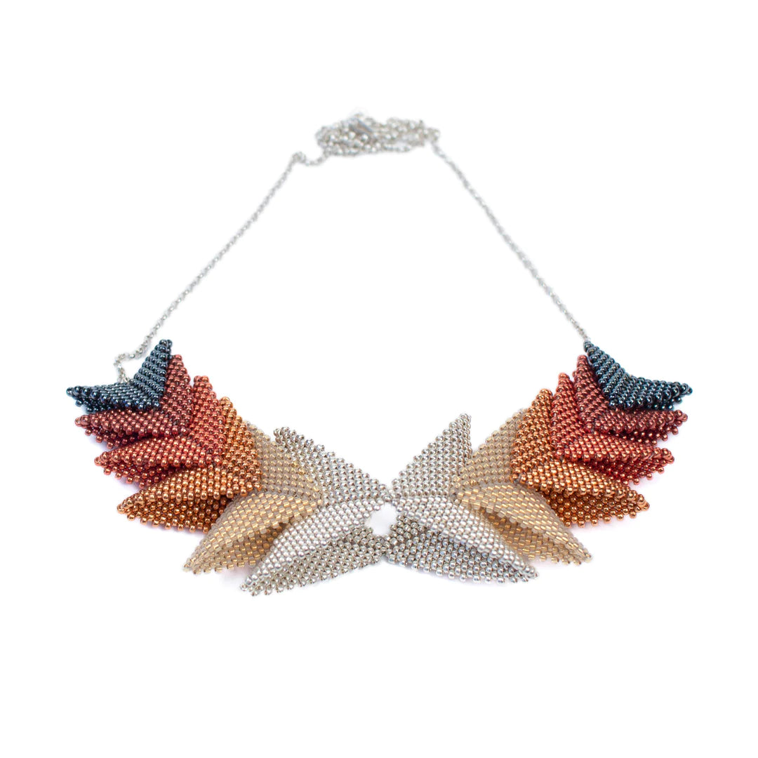The Thousand Hills Elements by Beloved Beadwork features a beautiful geometric design and coordinating colors. This piece accentuates the neckline with intricate adornment. Ten hours of intricate hand-weaving was required to make this stunning necklace.