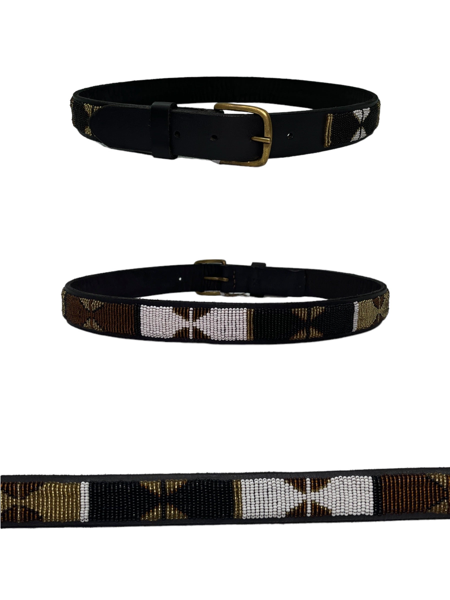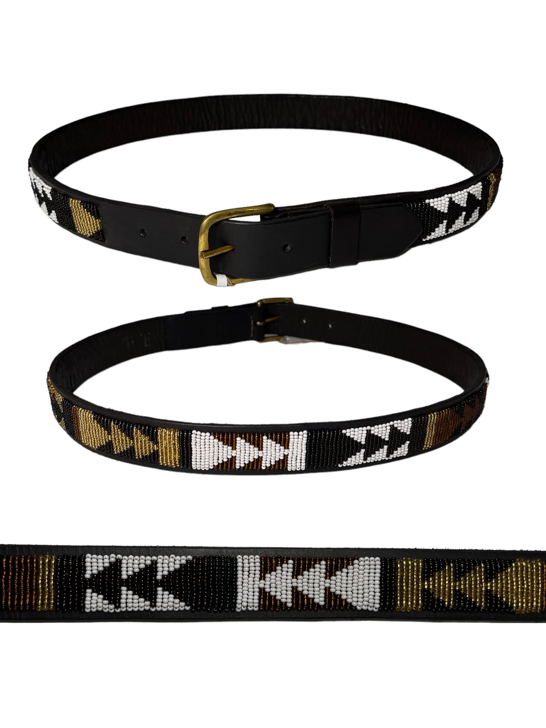 A beautifully handmade Maasai-style belt made using real glass beads, leather, and a recycled brass belt buckle. Each belt is sourced from the Nairobi area from local Maasai women. These belts are 1" wide.