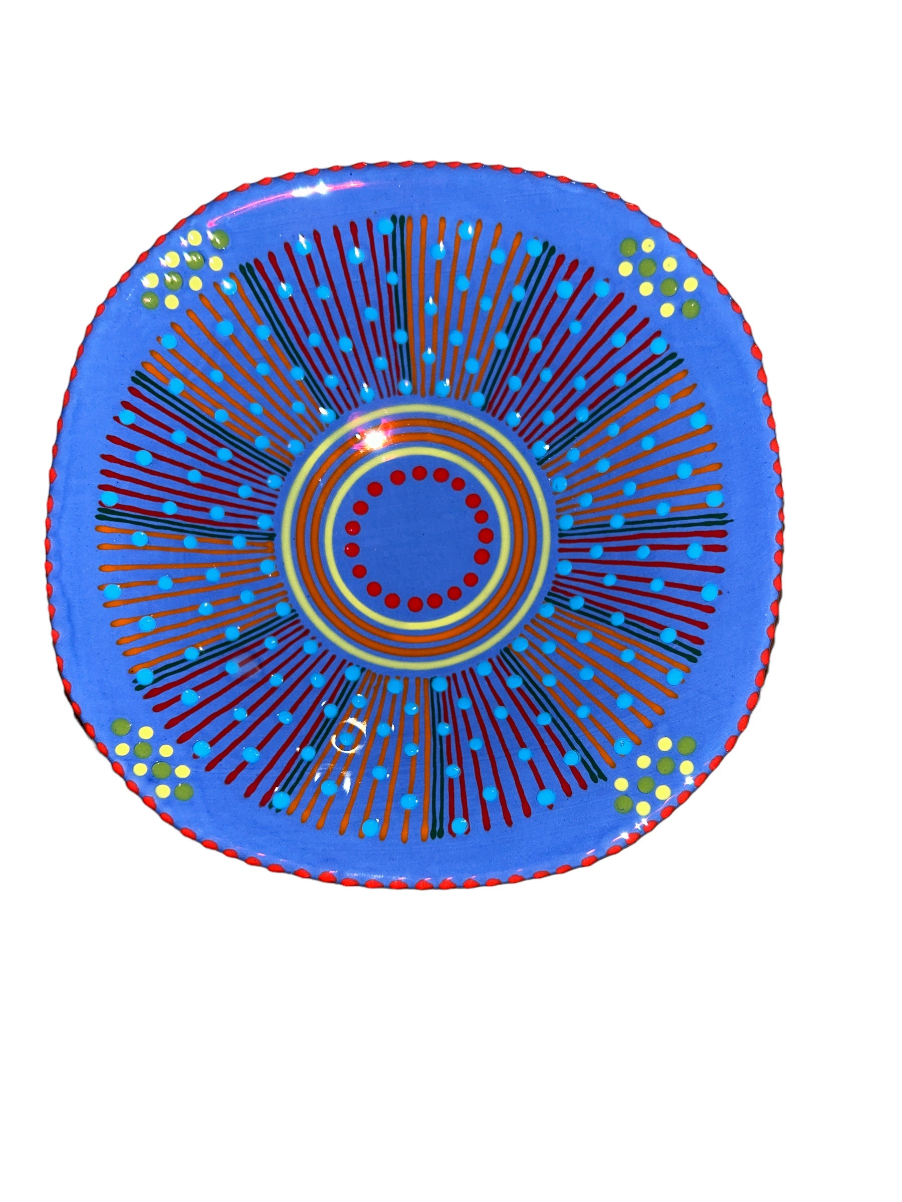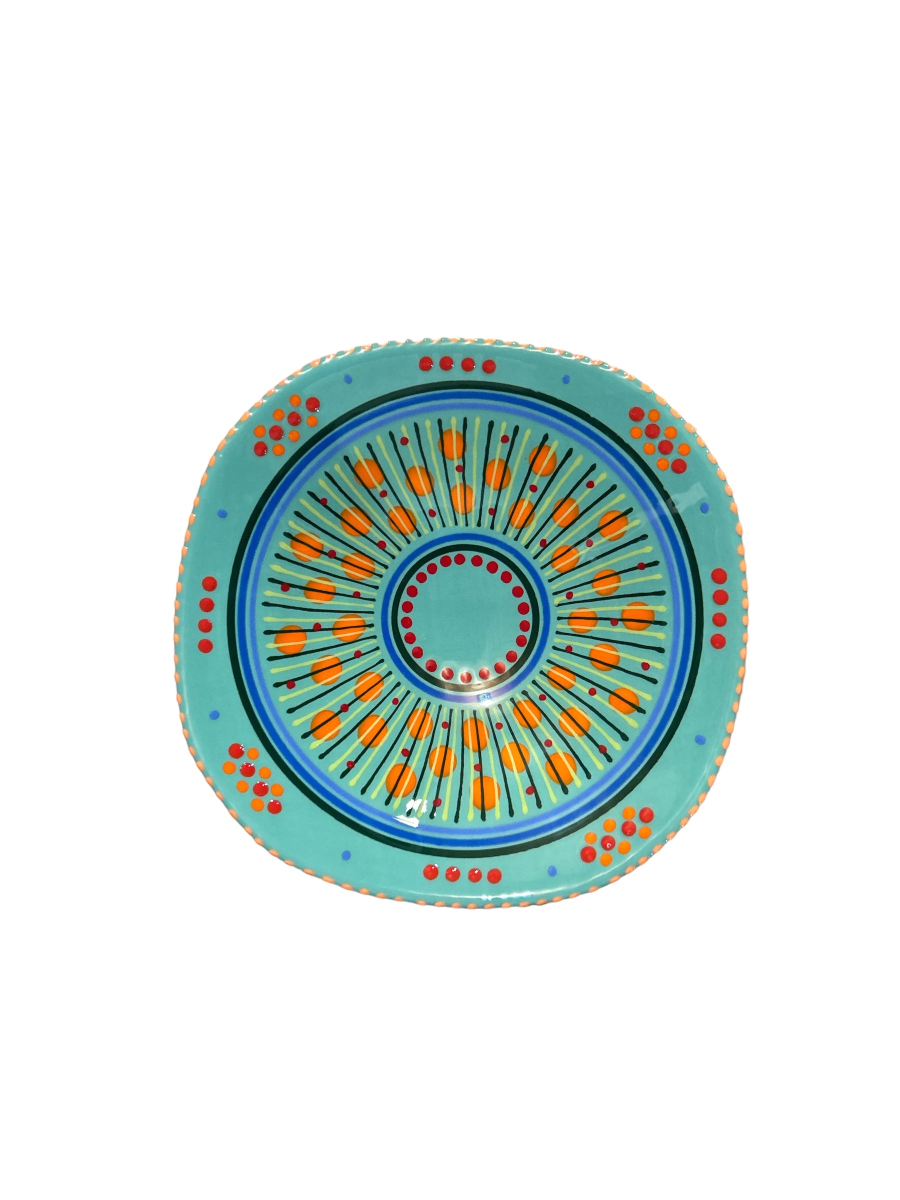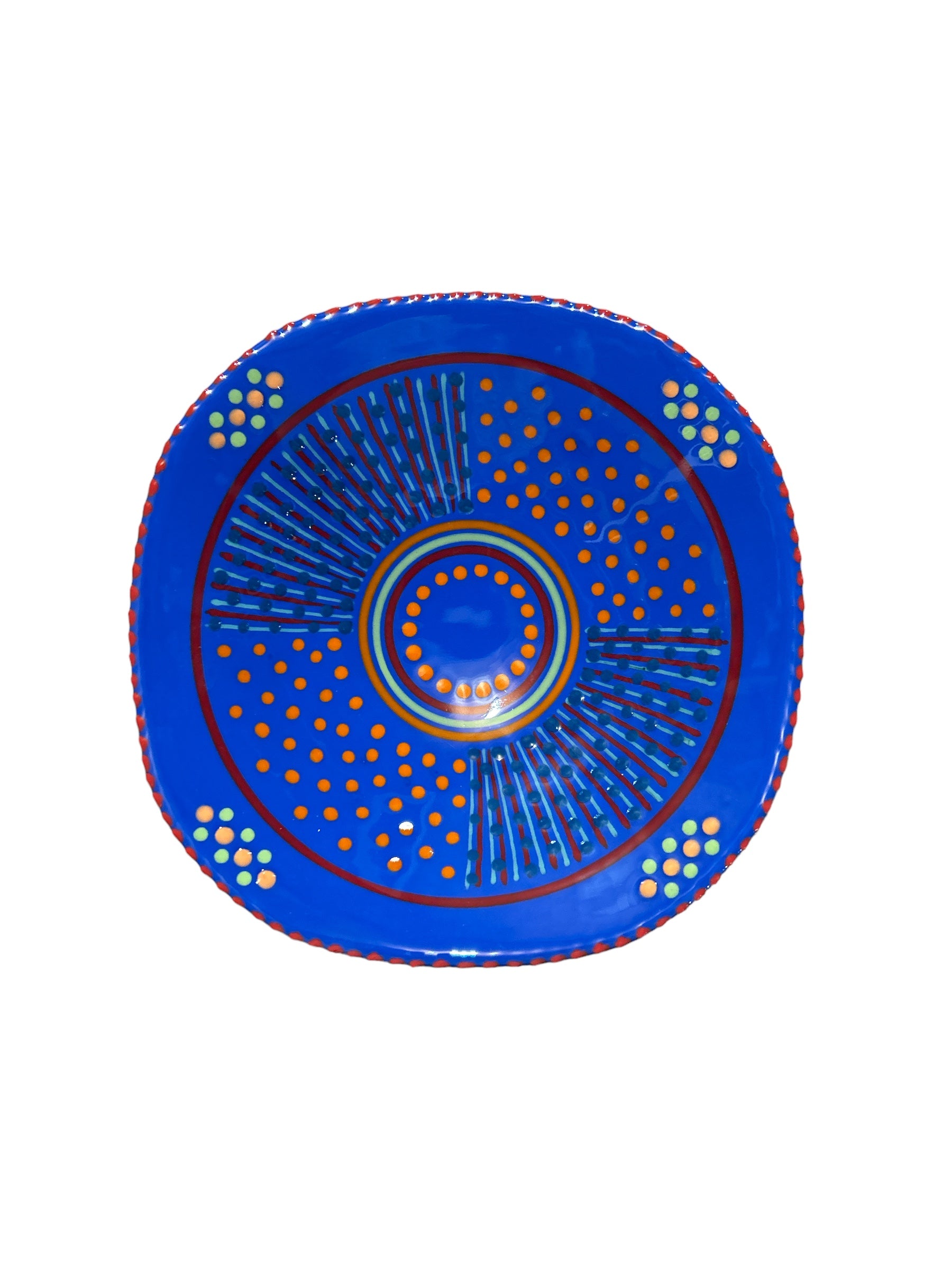 With a distinctive abstract African style using tactile, bead-like painting on hand-crafted ceramics, for which Potterswork is renowned, this piece was made by a master artisan. Each piece is made by a master artisan. No two works are identical. The main color option is listed and a representative photo is shown. You will receive a similar piece. As all are one of a kind the main color option best describes the piece. All separate pieces in this range coordinate with each other beautifully and can be mixed and matched to create a garden of colors on your table. If you desire to speak with one of our associates they can always pick and choose for you a color selection that will be unique, just like you!