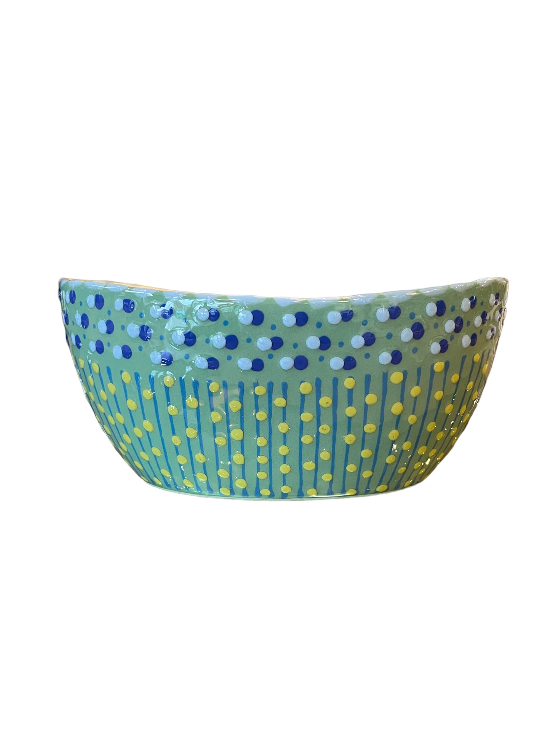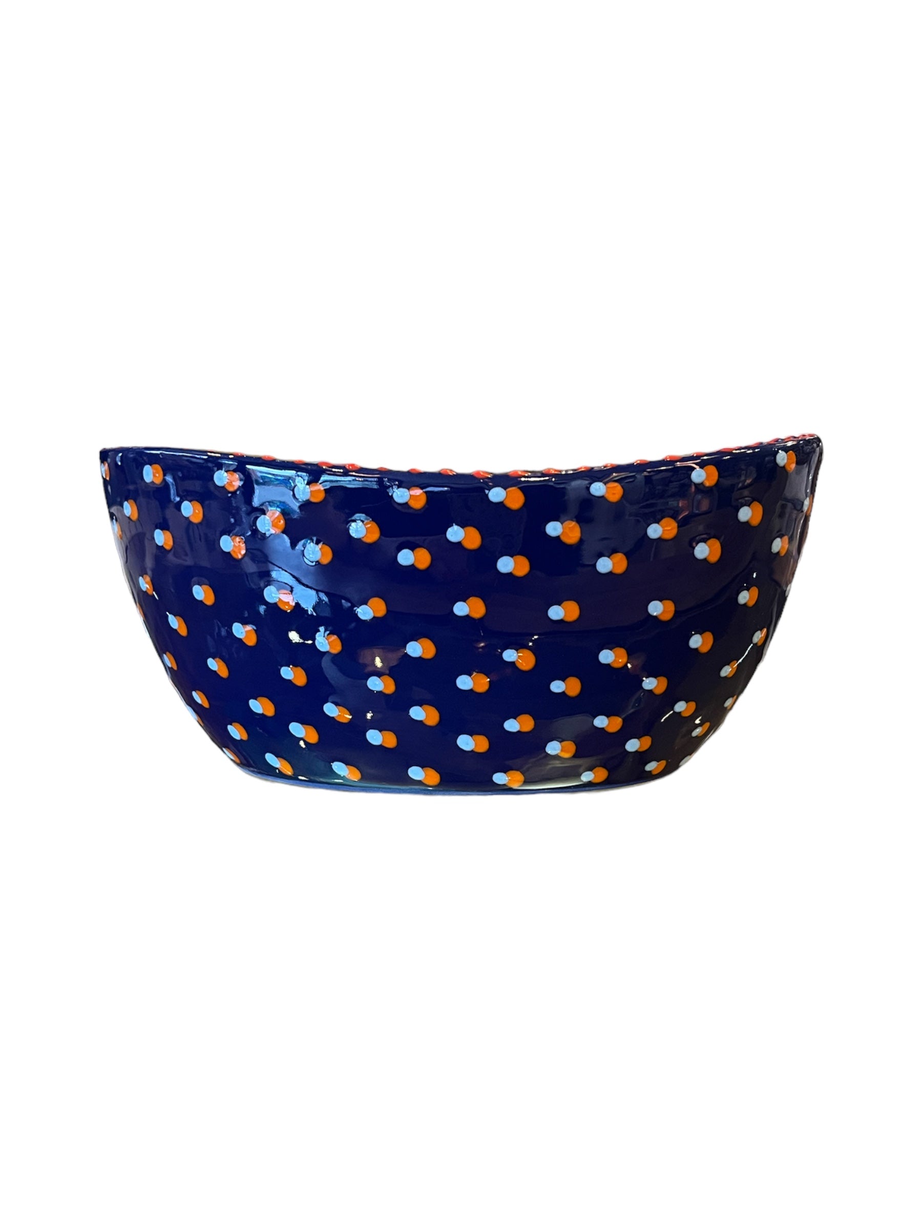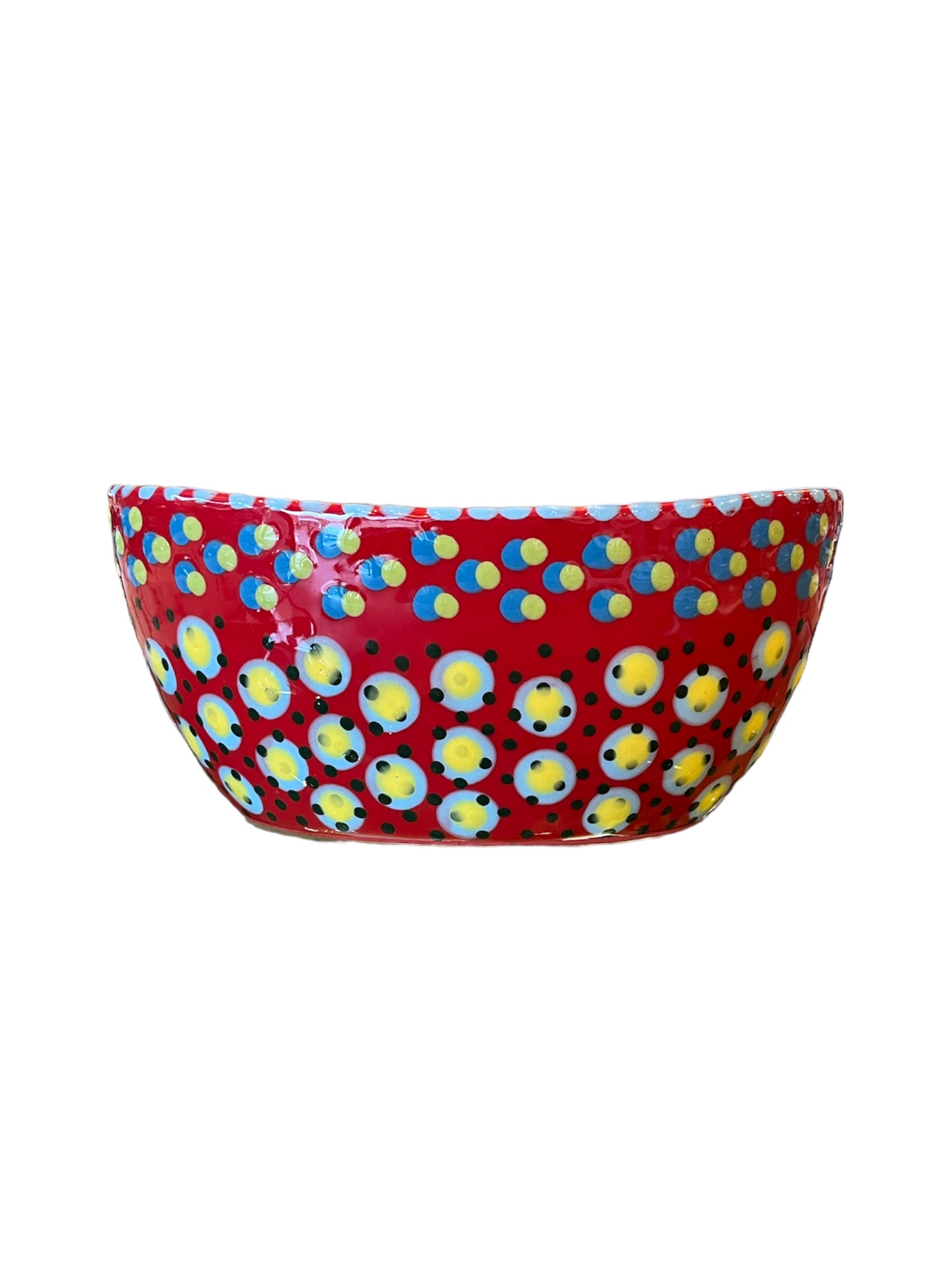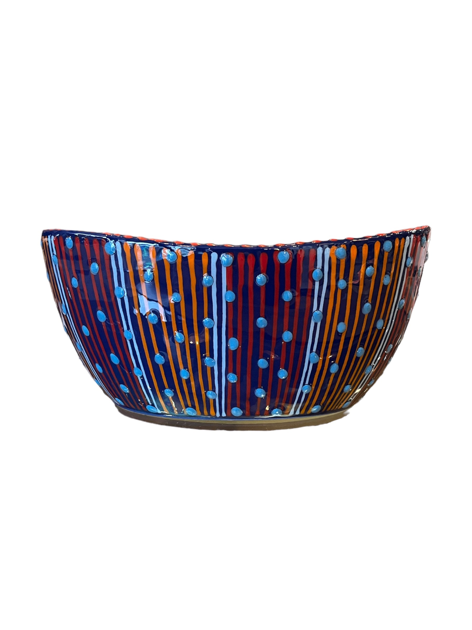 The Dessert Bowl is functional and also decorative - and no, it's not just for toffee! With a distinctive abstract African style using tactile, bead-like painting on hand-crafted ceramics, for which Potterswork is renowned, this piece was made by a master artisan. Each piece is made by a master artisan. No two works are identical. The main color option is listed and a representative photo is shown. You will receive a similar piece. As all are one of a kind the main color option best describes the piece. All separate pieces in the Classic range coordinate with each other beautifully and can be mixed and matched to create a garden of colors on your table. If you desire to speak with one of our associates they can always pick and choose for you a color selection that will be unique, just like you!