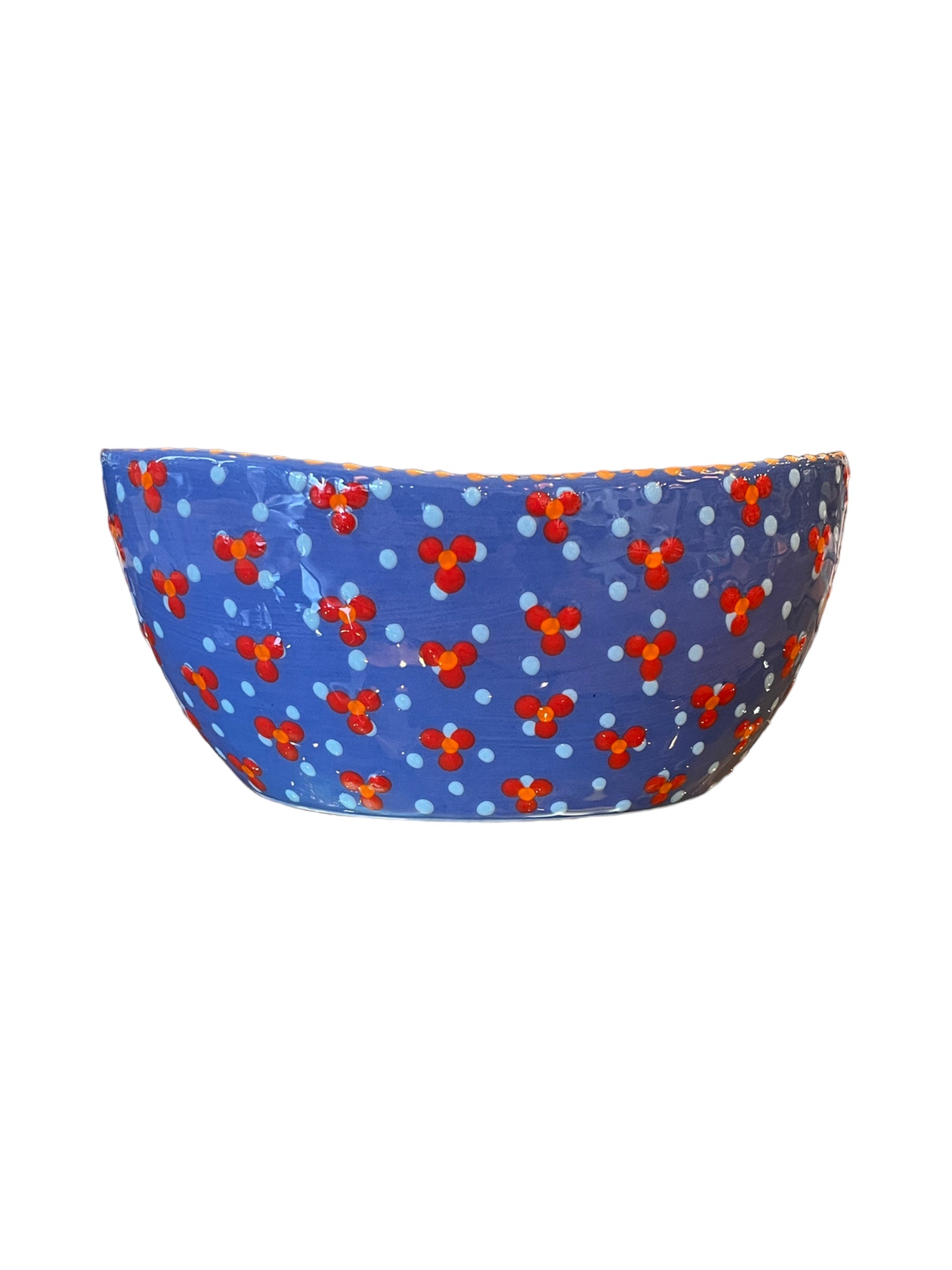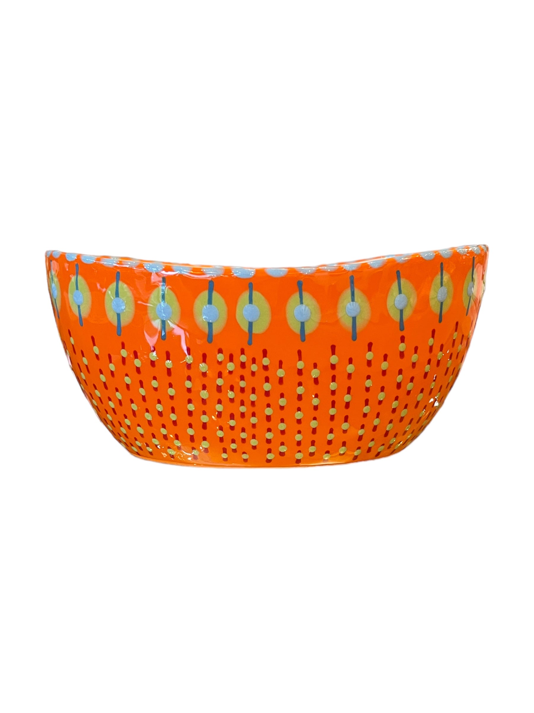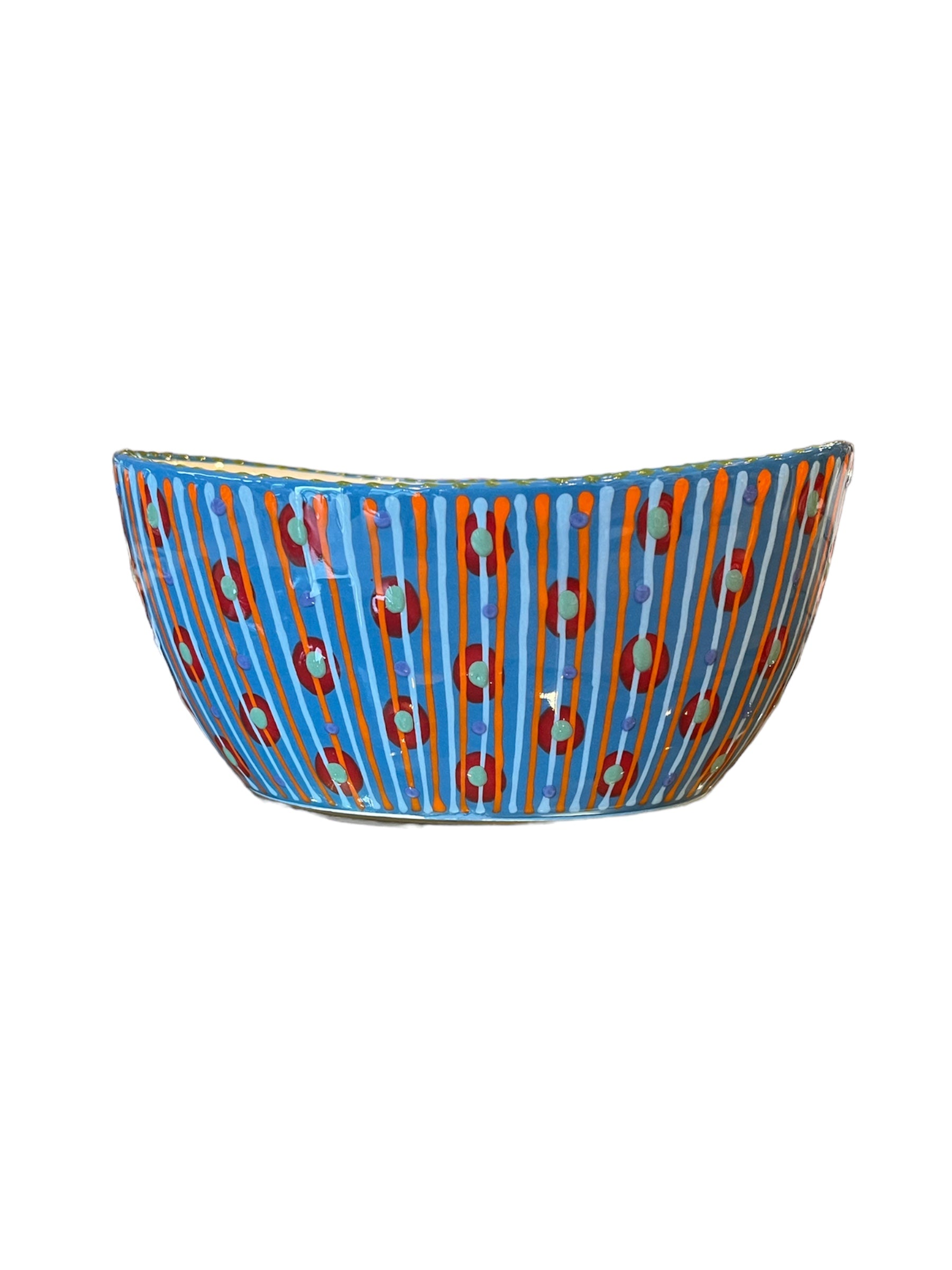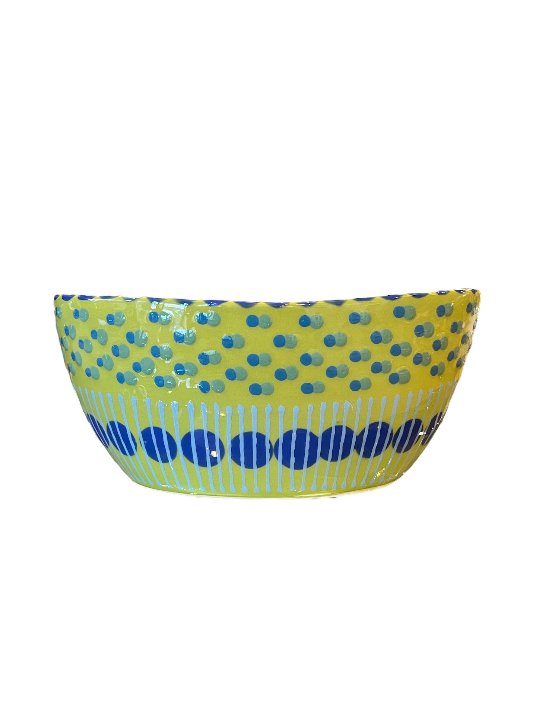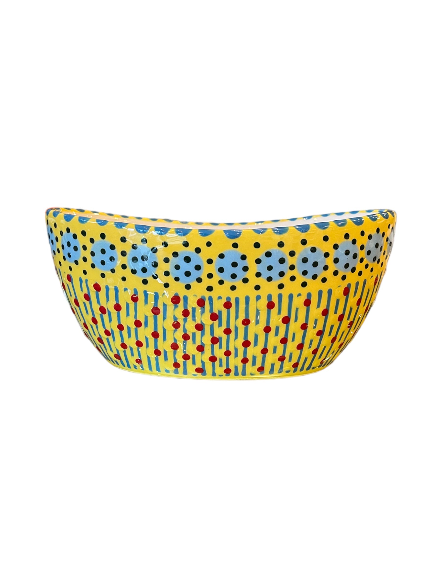 The Dessert Bowl is functional and also decorative - and no, it's not just for toffee! With a distinctive abstract African style using tactile, bead-like painting on hand-crafted ceramics, for which Potterswork is renowned, this piece was made by a master artisan. Each piece is made by a master artisan. No two works are identical. The main color option is listed and a representative photo is shown. You will receive a similar piece. As all are one of a kind the main color option best describes the piece. All separate pieces in the Classic range coordinate with each other beautifully and can be mixed and matched to create a garden of colors on your table. If you desire to speak with one of our associates they can always pick and choose for you a color selection that will be unique, just like you!