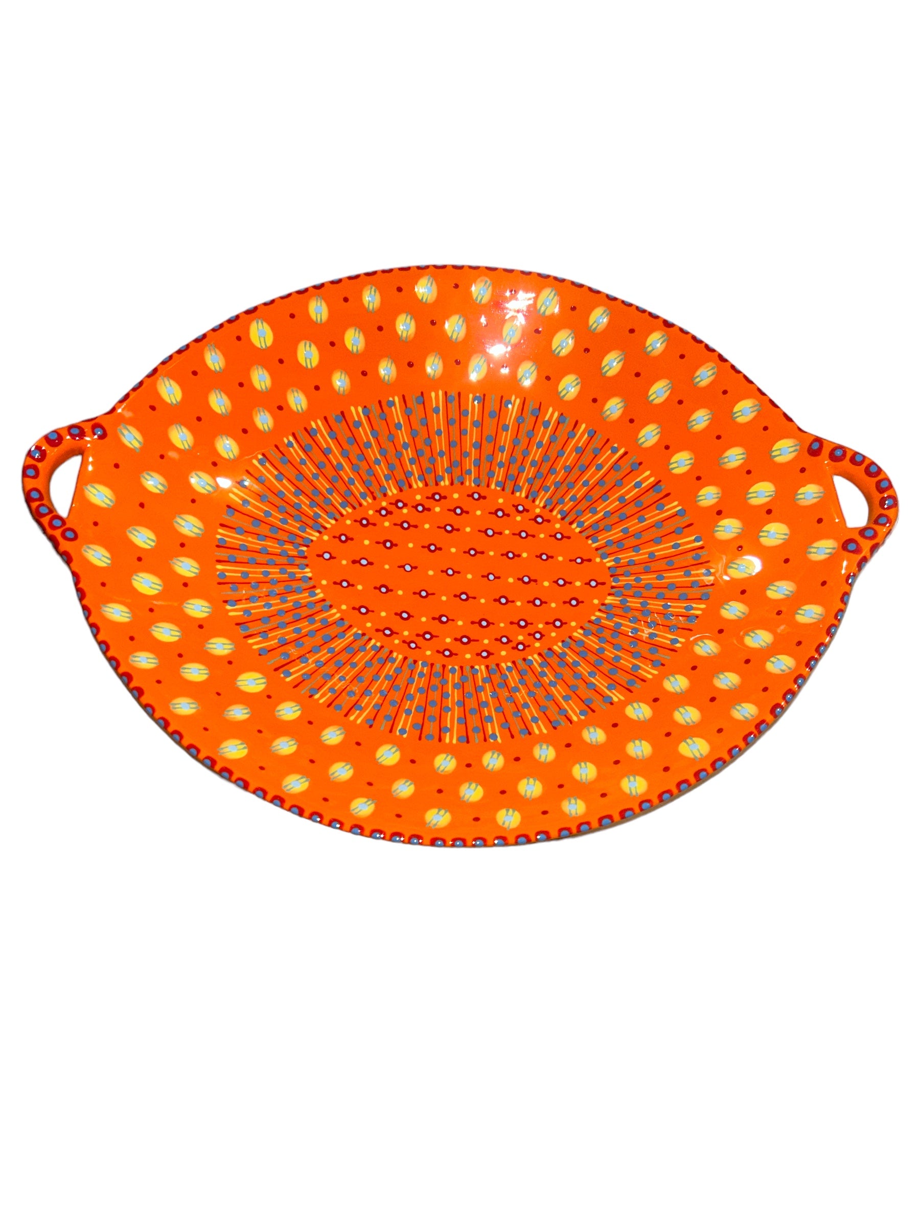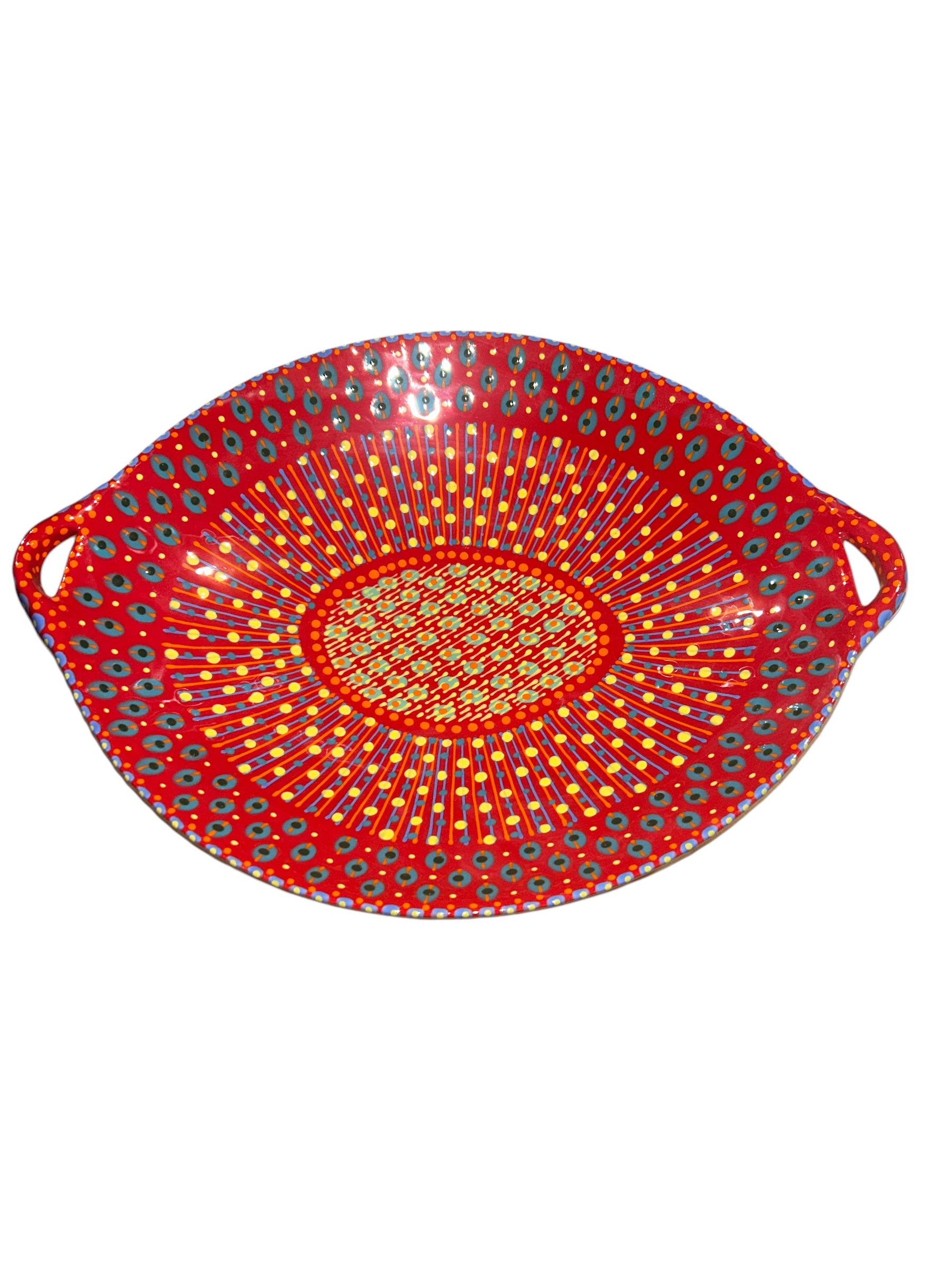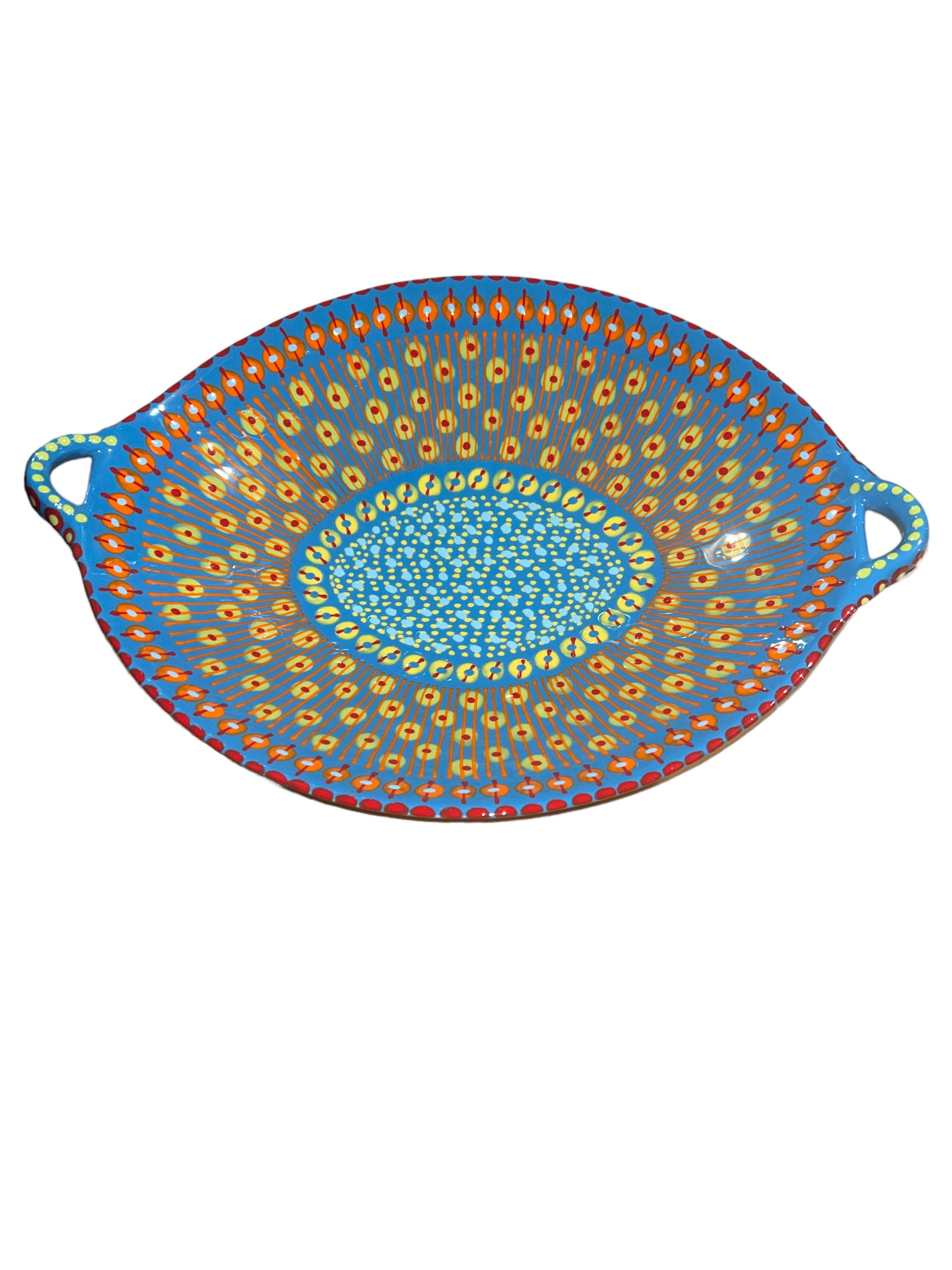 This generously sized Oval Bowl with Handles adds bold colors to your table. With a distinctive abstract African style using tactile, bead-like painting on hand-crafted ceramics, for which The Potter’s Workshop is renowned, this piece was made by a master artisan. Each piece is made by a master artisan. No two works are identical. The main color option is listed and a representative photo is shown. You will receive a similar piece. As all are one of a kind the main color option best describes the piece. All separate pieces coordinate with each other beautifully and can be mixed and matched to create a garden of colors on your table. If you desire to speak with one of our associates they can always pick and choose for you a color selection that will be unique, just like you!