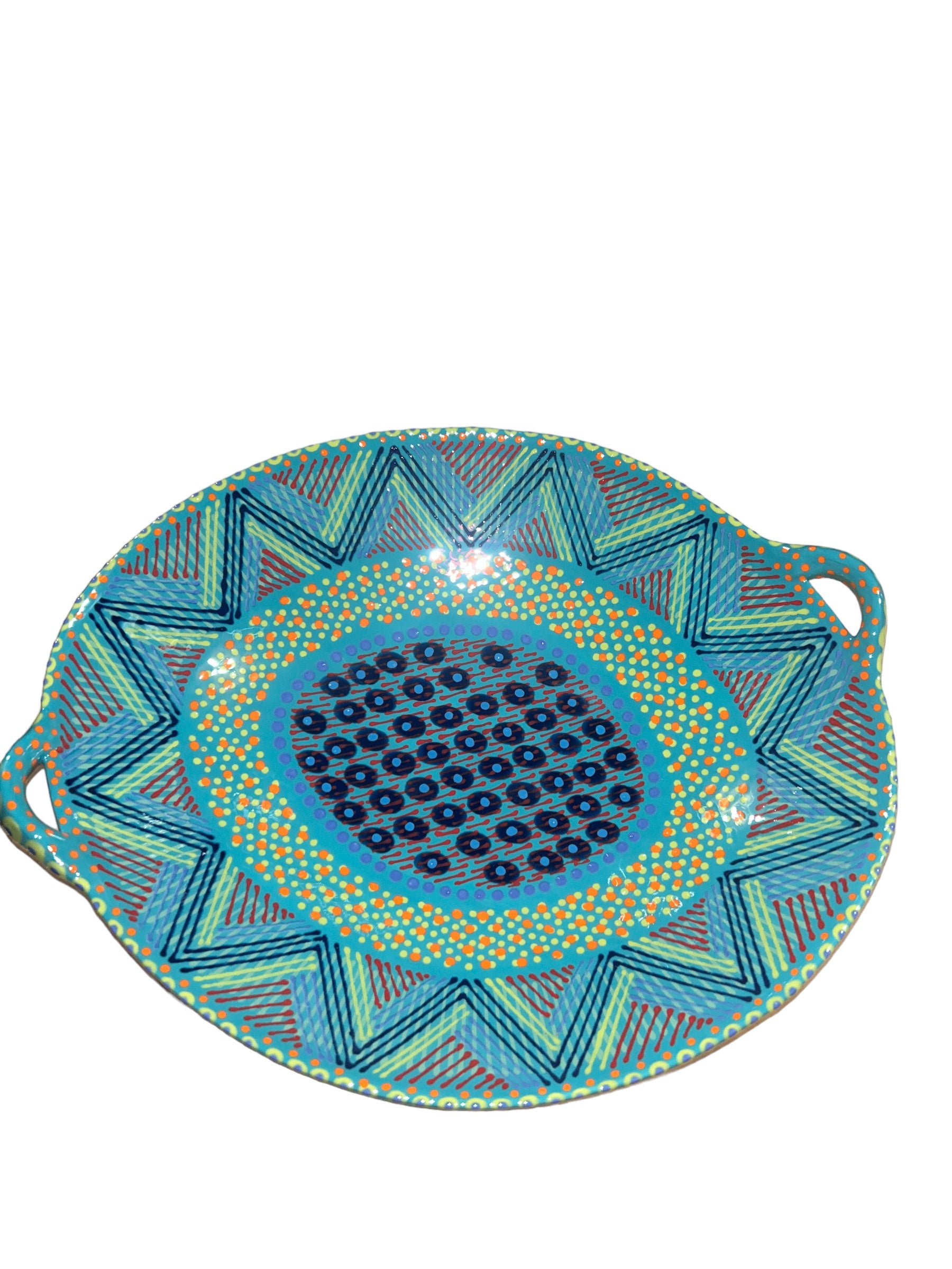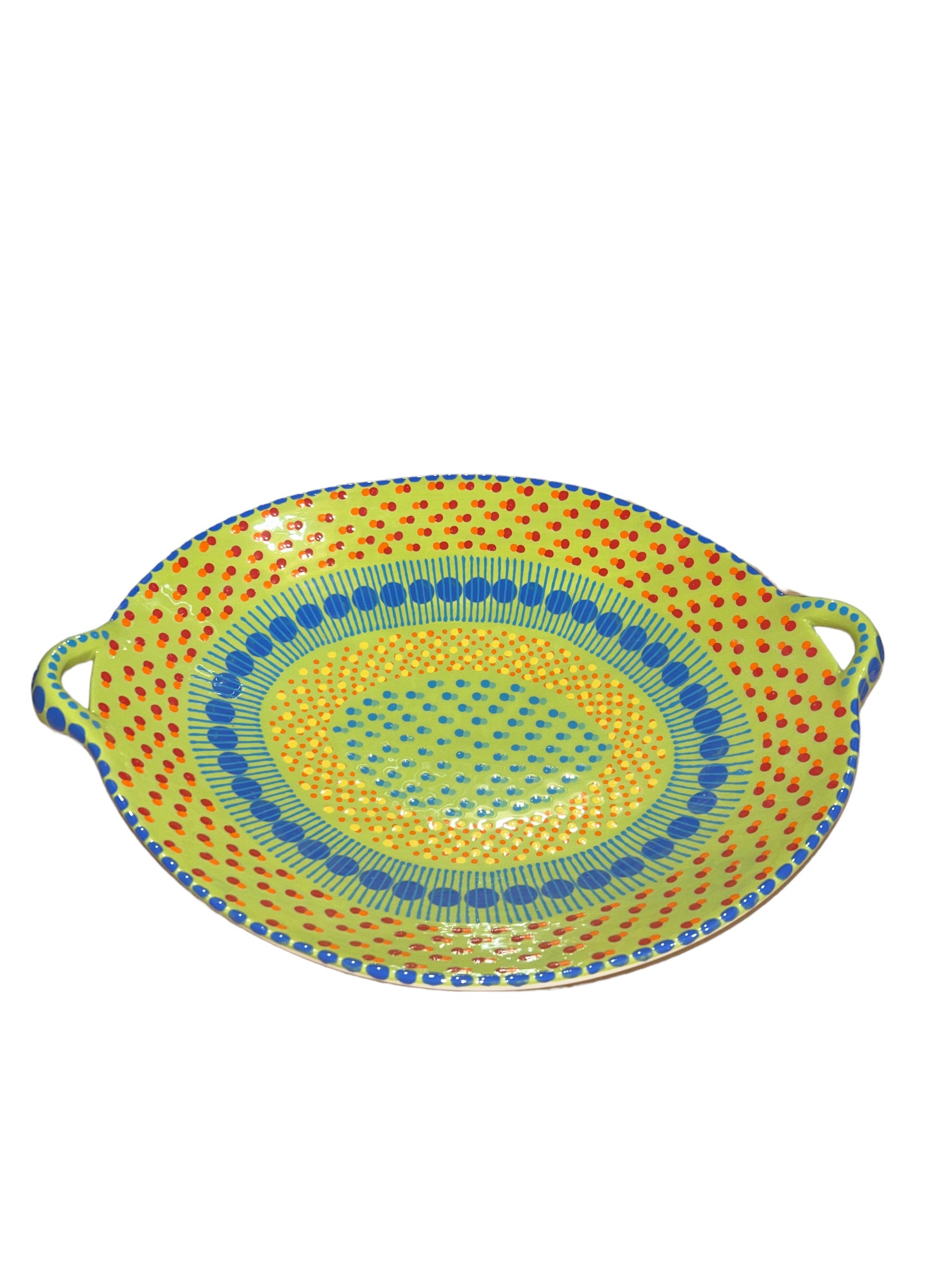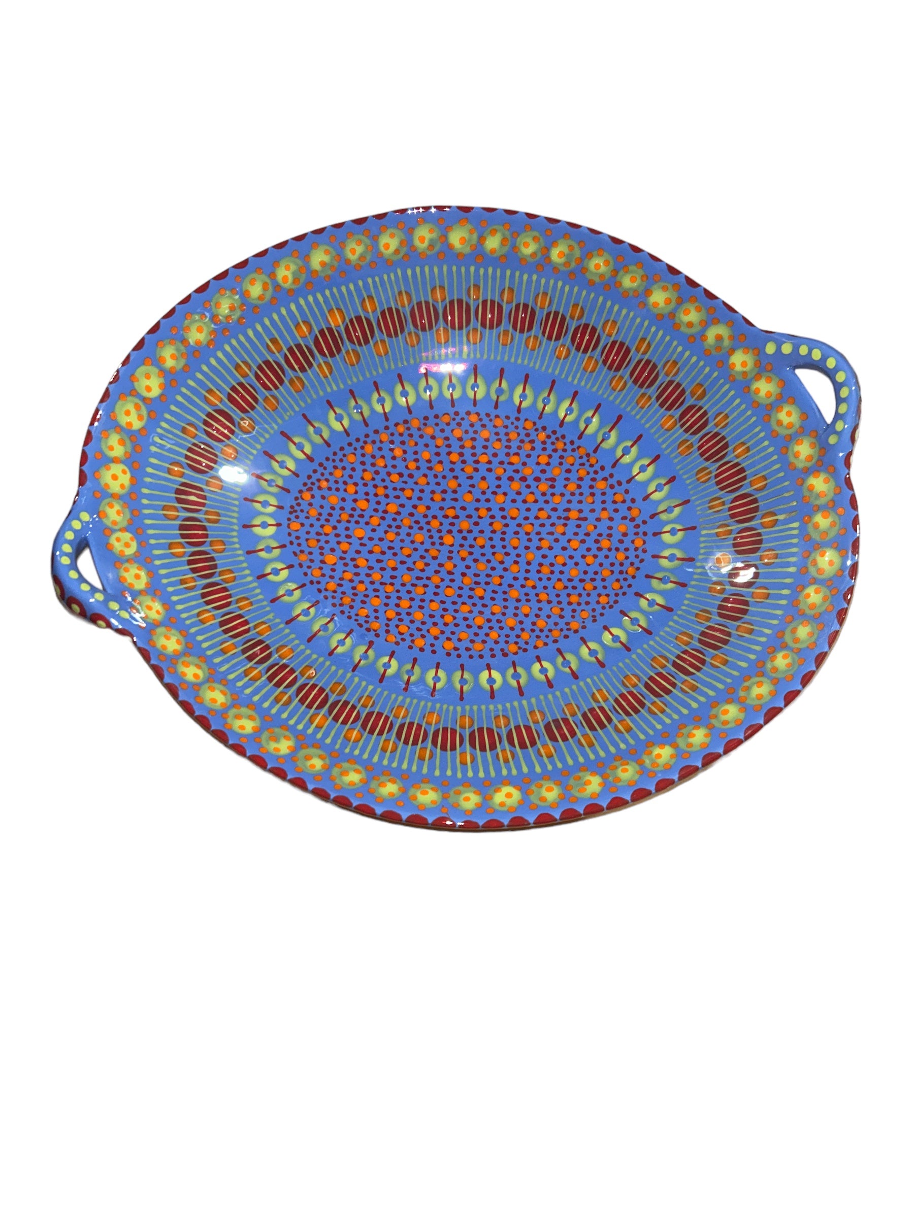 This generously sized Oval Bowl with Handles adds bold colors to your table. With a distinctive abstract African style using tactile, bead-like painting on hand-crafted ceramics, for which The Potter’s Workshop is renowned, this piece was made by a master artisan. Each piece is made by a master artisan. No two works are identical. The main color option is listed and a representative photo is shown. You will receive a similar piece. As all are one of a kind the main color option best describes the piece. All separate pieces coordinate with each other beautifully and can be mixed and matched to create a garden of colors on your table. If you desire to speak with one of our associates they can always pick and choose for you a color selection that will be unique, just like you!