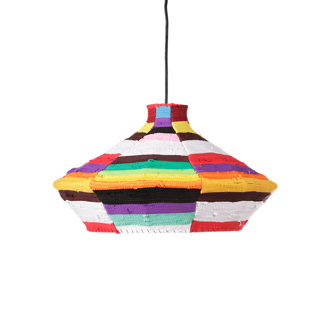 Ashanti Designs Large Cholo Pendant Lampshade is the perfect colorful addition to any living space lighting arrangement. Wrapped on a sturdy metal frame to the highest quality standards. Crafted with African classical weaving techniques from recycling T-shirt material that would otherwise be discarded into landfills. Each T-shirt is hand-stripped, dyed by hand, re-woven and then crafted into this iconic, colorful piece. 100% Handwoven from upcycled fabric offcuts. Approx. Size: 20" D x 11" H. Electrical fittings are not included.