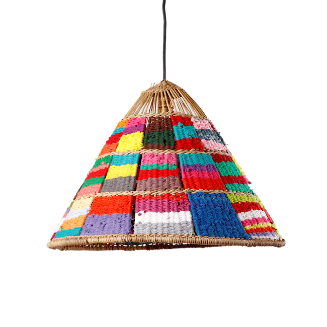Ashanti Designs Venda Lampshade is the perfect addition to any living space lighting arrangement. 100% Handwoven from upcycled fabric offcuts. Wrapped on a sturdy metal frame to the highest quality standards. Crafted with African classical weaving techniques from recycling T-shirt material that would otherwise be discarded into landfills. Each T-shirt is hand-stripped, dyed by hand, re-woven and then crafted into this iconic, colorful piece. Approx. Size: 16" D x 14" H. Electrical fittings are not included.