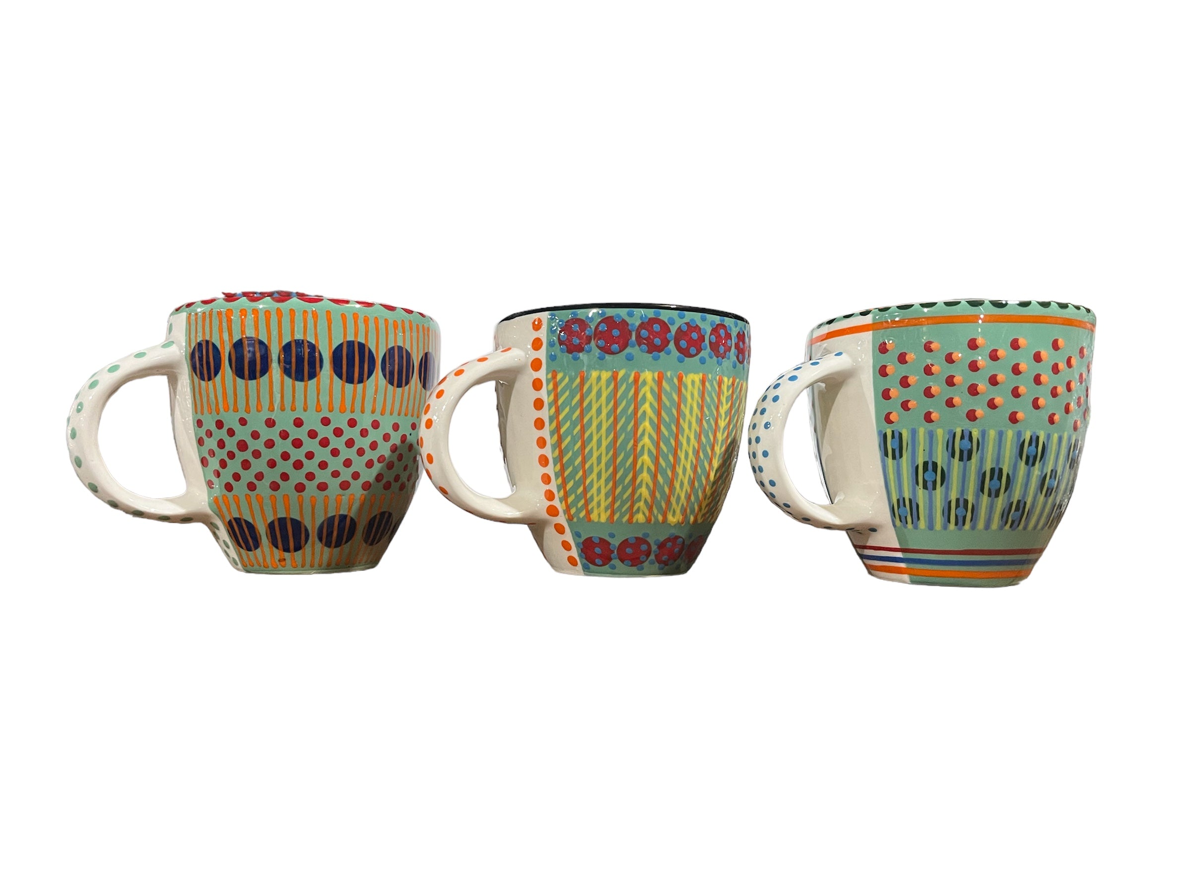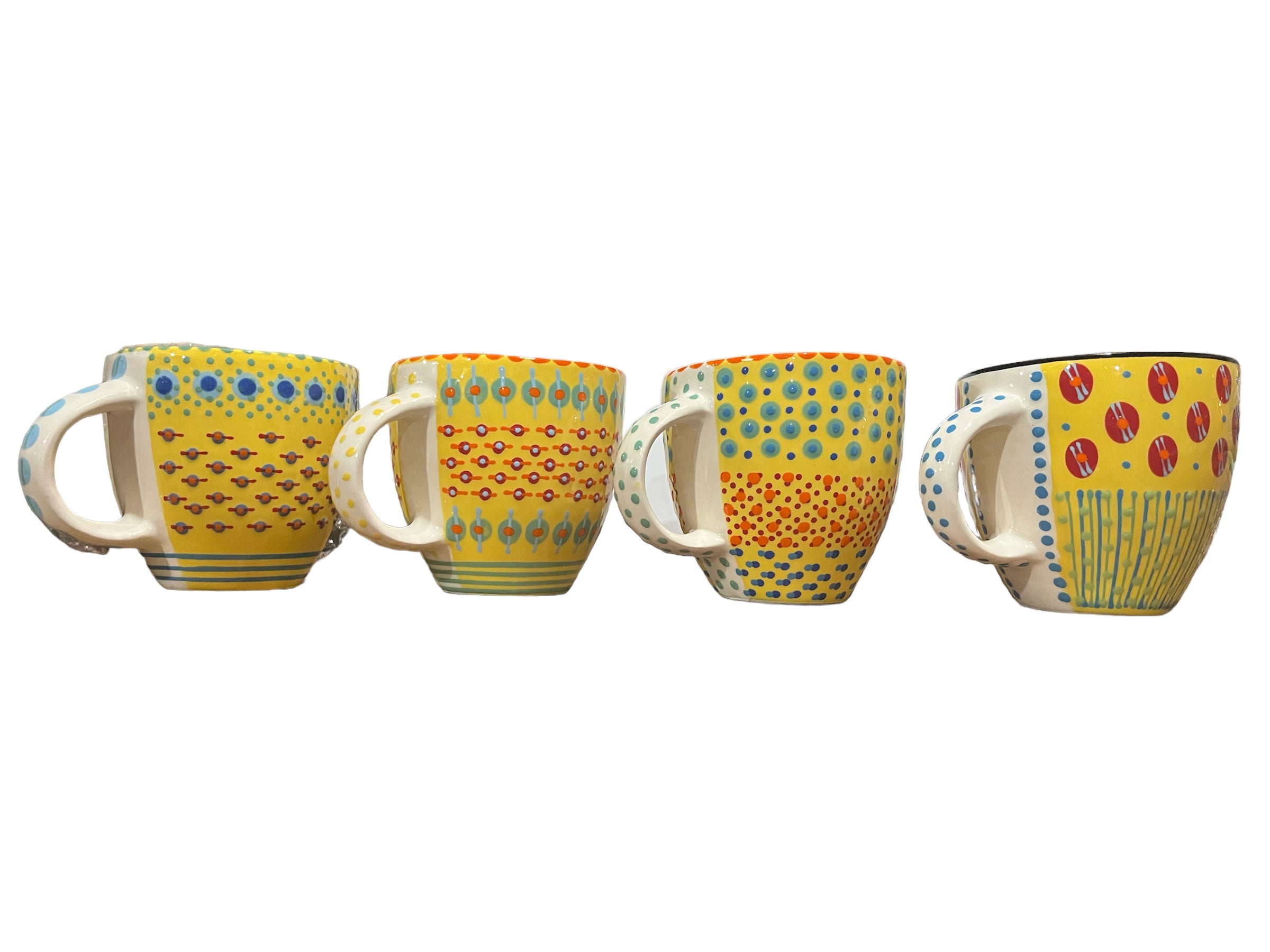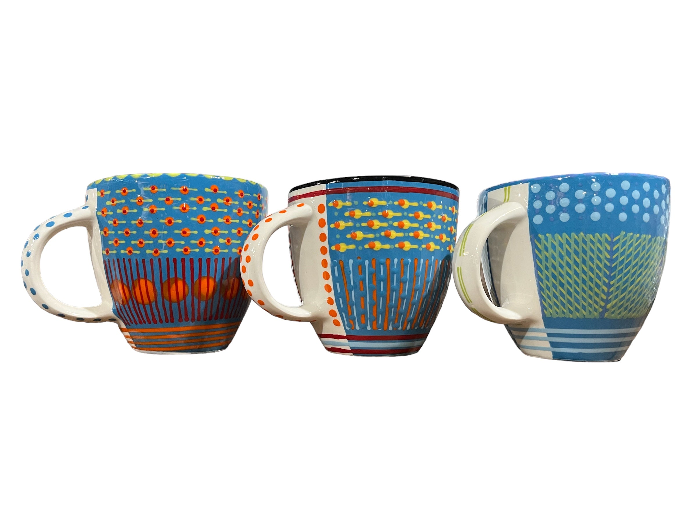 The Jumbo Mug is the perfect coffee companion. Colorful and fun, and all made my hand. With a distinctive abstract African style using tactile, bead-like painting on hand-crafted ceramics, for which The Potterswork is renowned, this piece was made by a master artisan. Each piece is made by a master artisan. No two works are identical. The main color option is listed and a representative photo is shown. You will receive a similar piece. As all are one of a kind the main color option best describes the piece. All separate pieces in the Classic range coordinate with each other beautifully and can be mixed and matched to create a garden of colors on your table. If you desire to speak with one of our associates they can always pick and choose for you a color selection that will be unique, just like you!