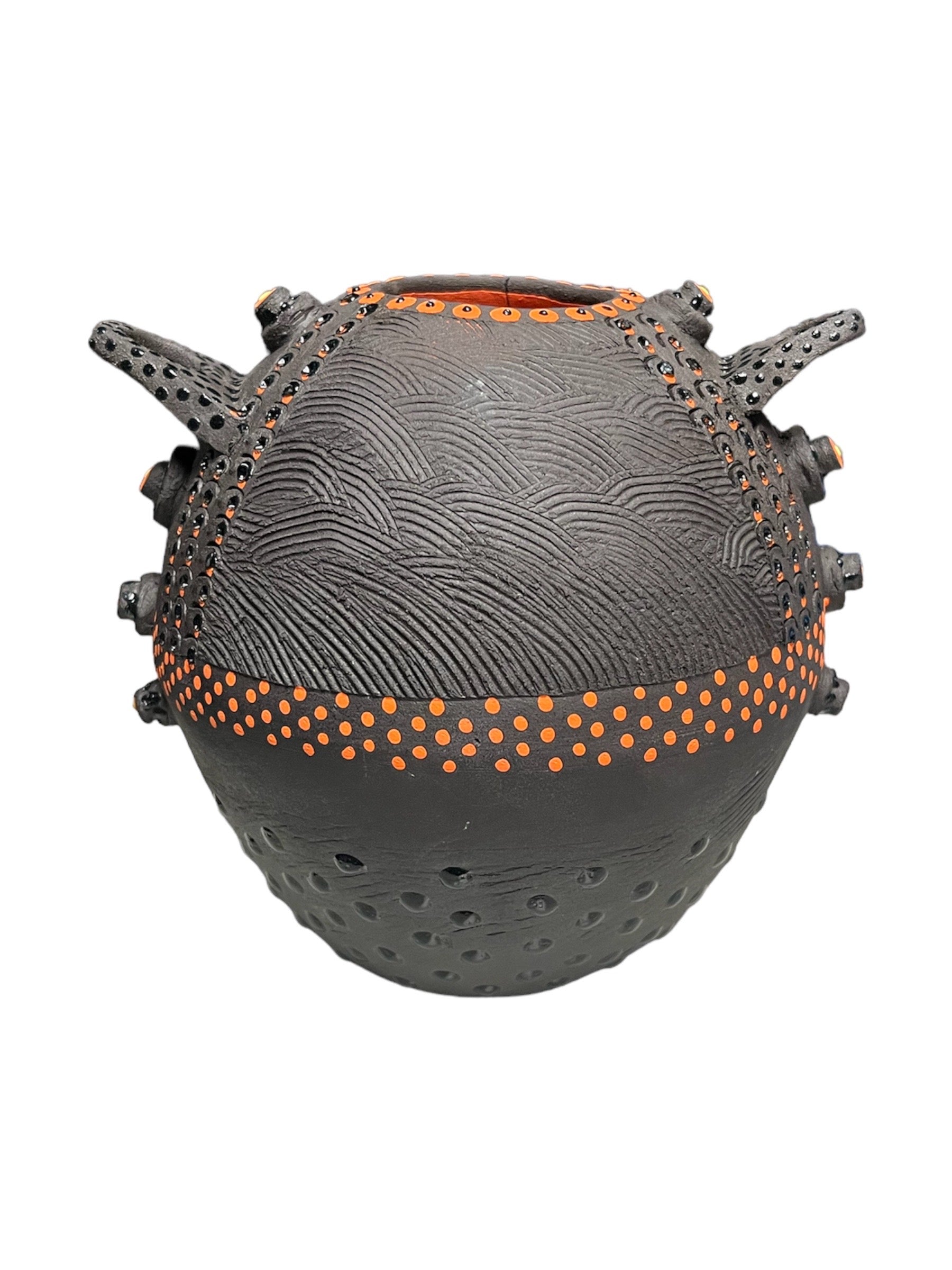 "IMBIZO" puts a modern twist on the traditional clay beer pot, yet does not move too far from the origins of a first nations people. The miniature pots are hand molded from black clay and adorned with vibrant African colors. They represent an imbizo, or gathering, where a chief or leader summons his subordinates to discuss tribal affairs. Each person at an imbizo has their own container, and if the beer or food has been poisoned or tampered with, the source can be easily identified. Traditionally, the chief drinks from a more sophisticated beer pot than all others.
