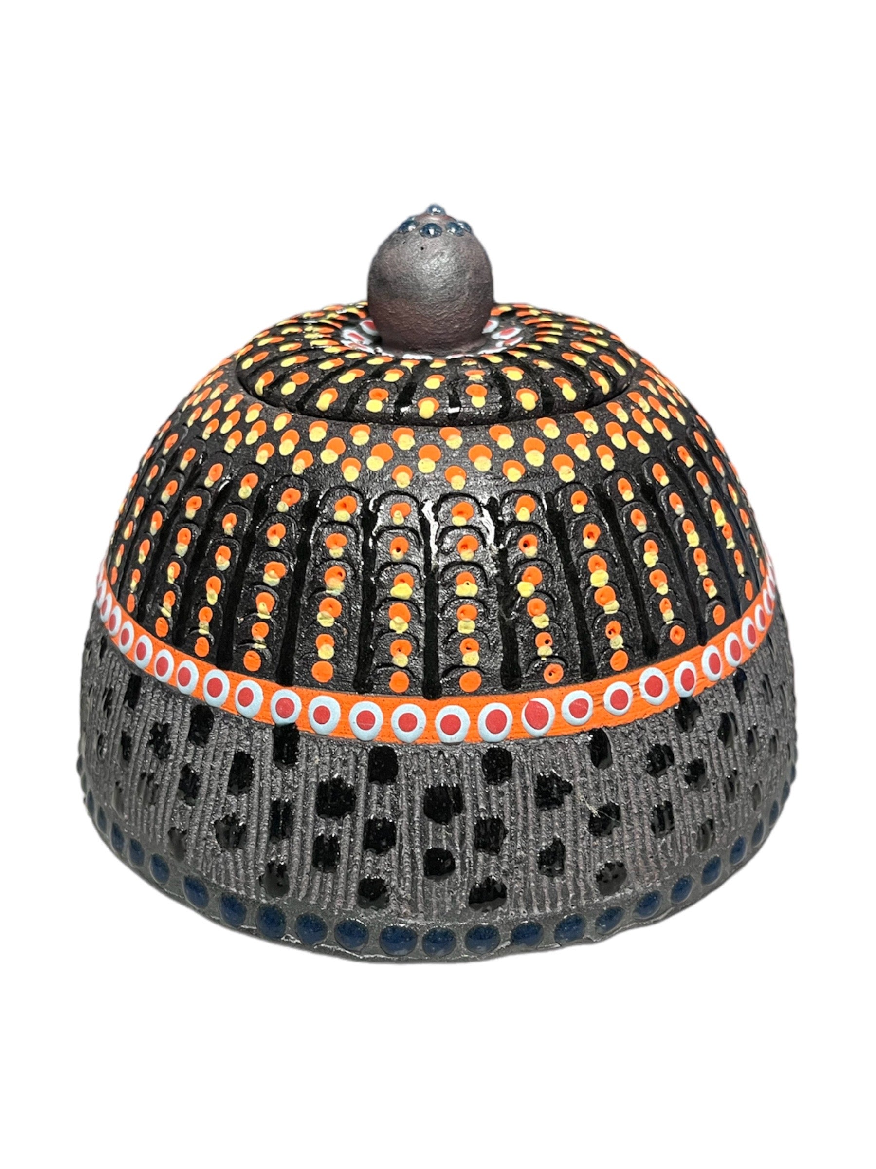 A hand-built shape based on traditional clay storage vessels and decorated with Fezile's unique painting style that draws on traditional African motifs and patterns.