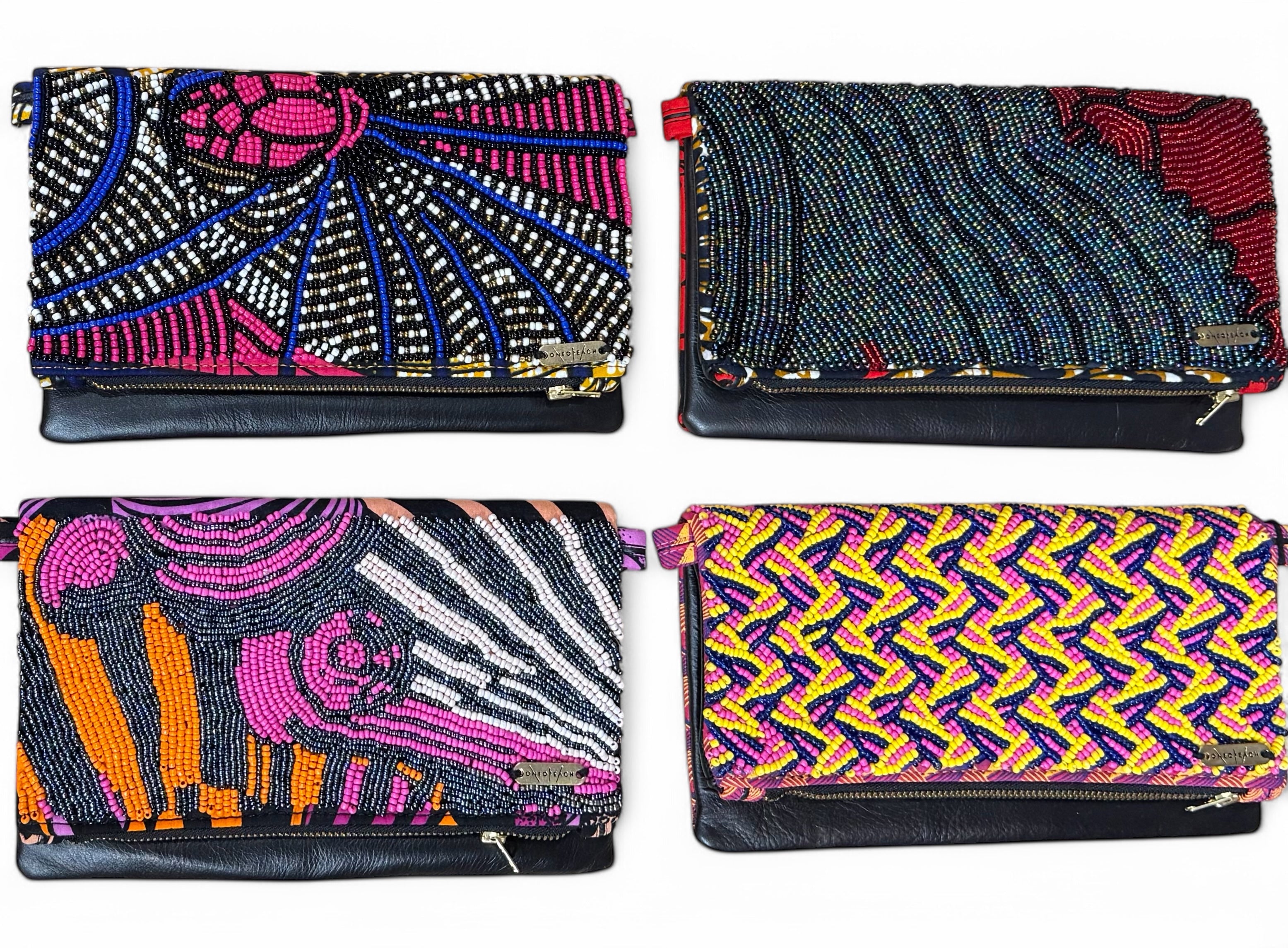 These hand-beaded wax print and Ox leather fold-over luxury clutch bags are inspired by the colors of the galaxies.