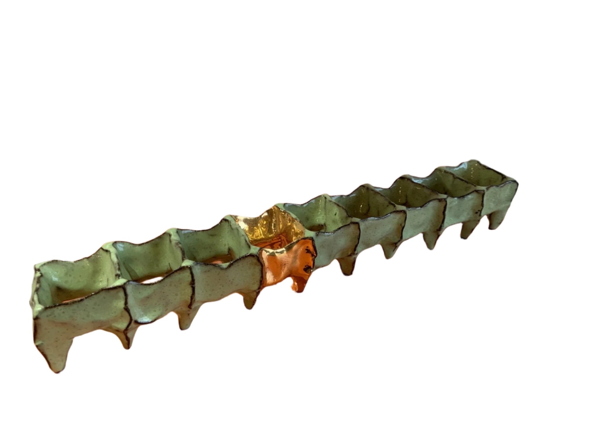 The Boogie Woogie series was inspired by the Dutch painter Mondrian’s painting “Broadway Boogie Woogie.” The hand built ceramic “Boogie Woogies” are abstract ceramic forms that allude to the crude mark making found in some urban contemporary art. The forms show the contrast, vibrancy, and energy of a living city. Not only are the forms architectural but they become the creatures which populate the structured chaos of cities themselves.