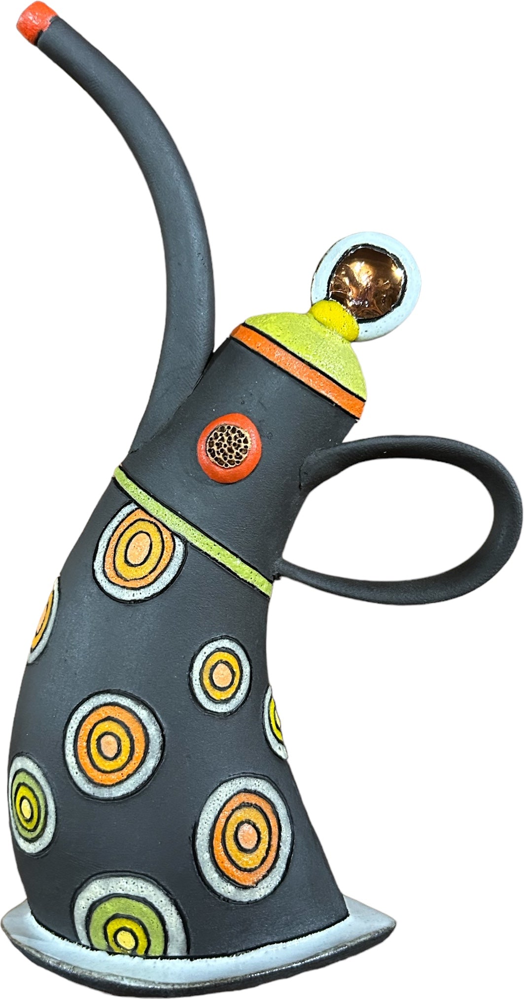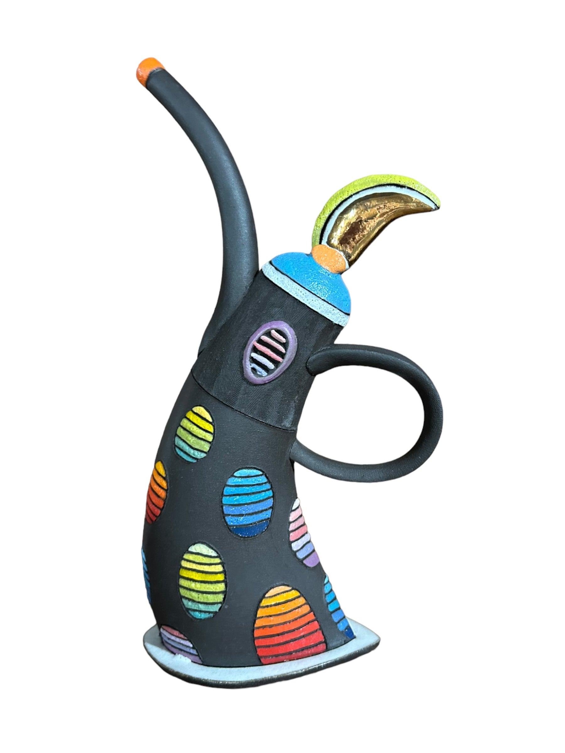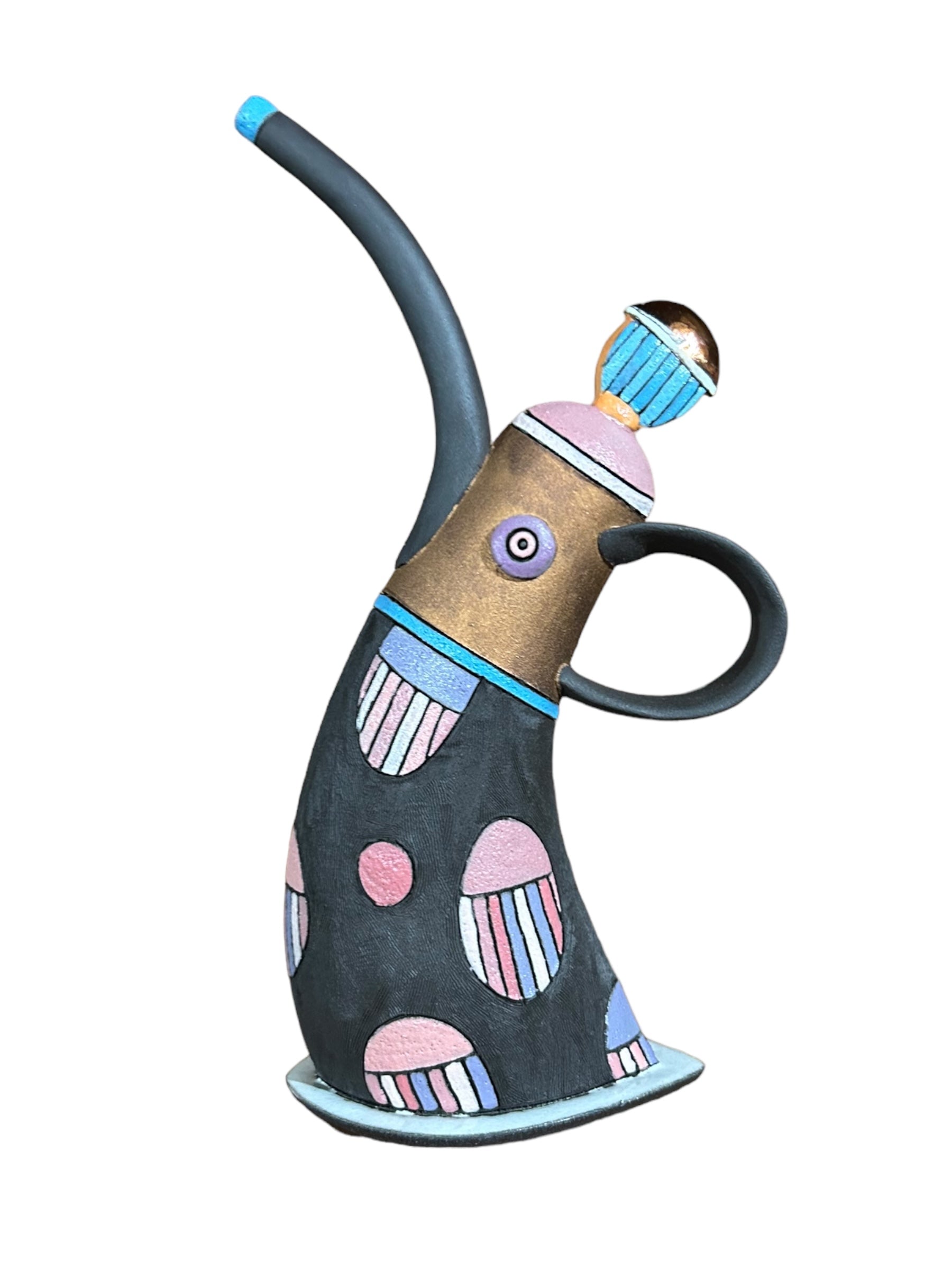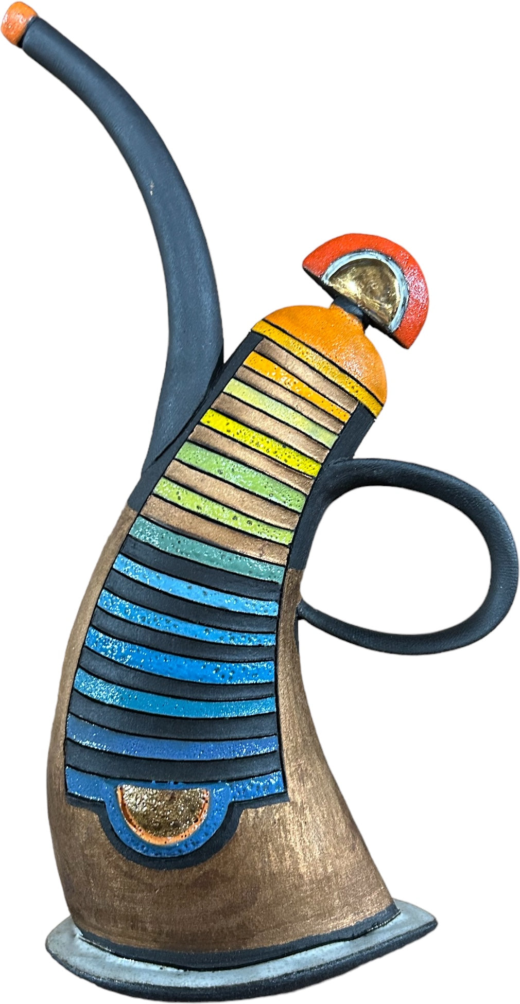 These whimsical caricatures of teapots were created by Hennie Meyer, an acclaimed Artist and ceramist.  They will bring a joyful spirit to your home, or are wonderful gifts to share with those who have a unique flair!  They are for decoration, and cannot pour actual tea - just in case you were fooled.  All are one of a kind, hand created, fired, and hand painted.