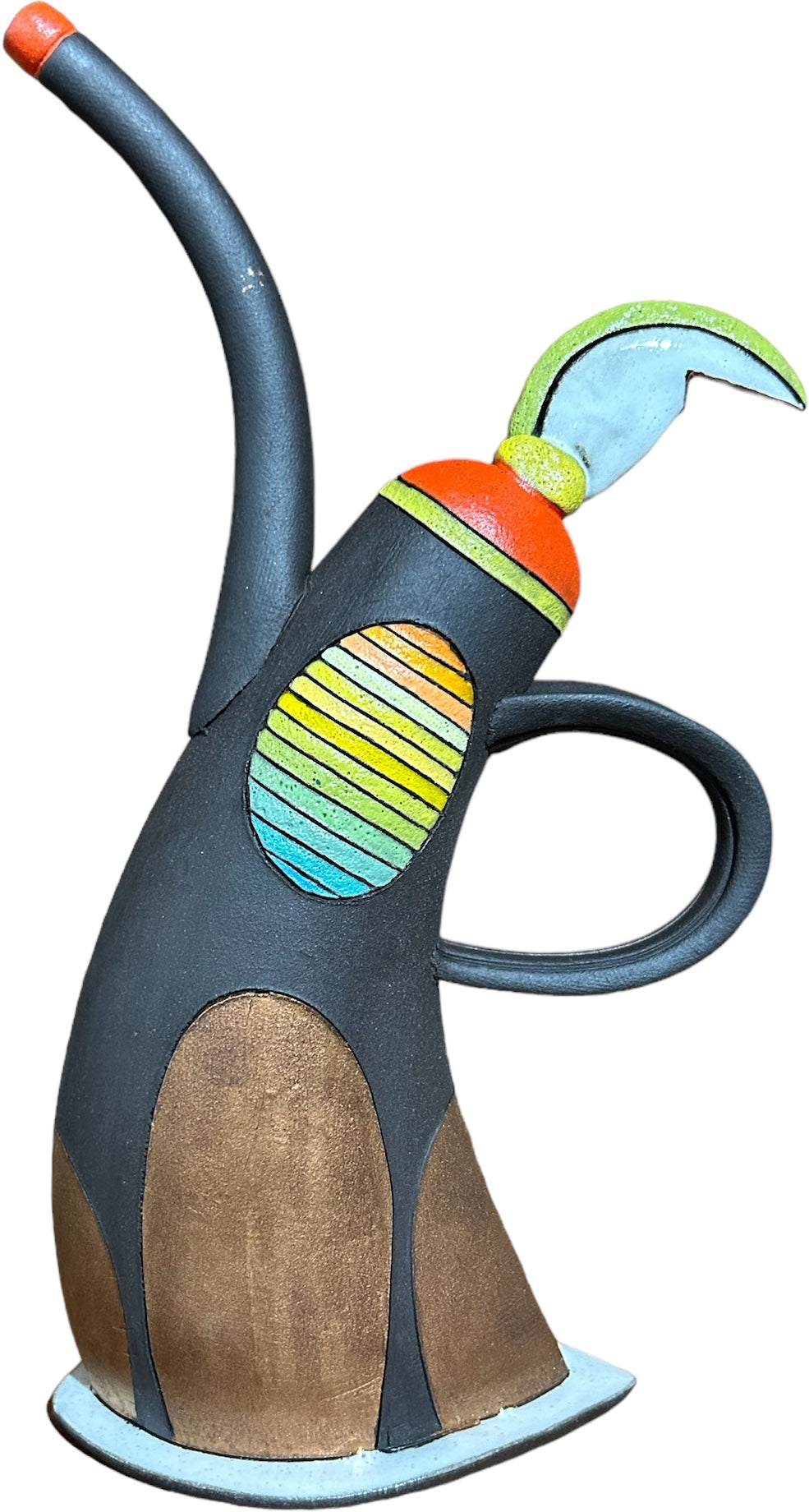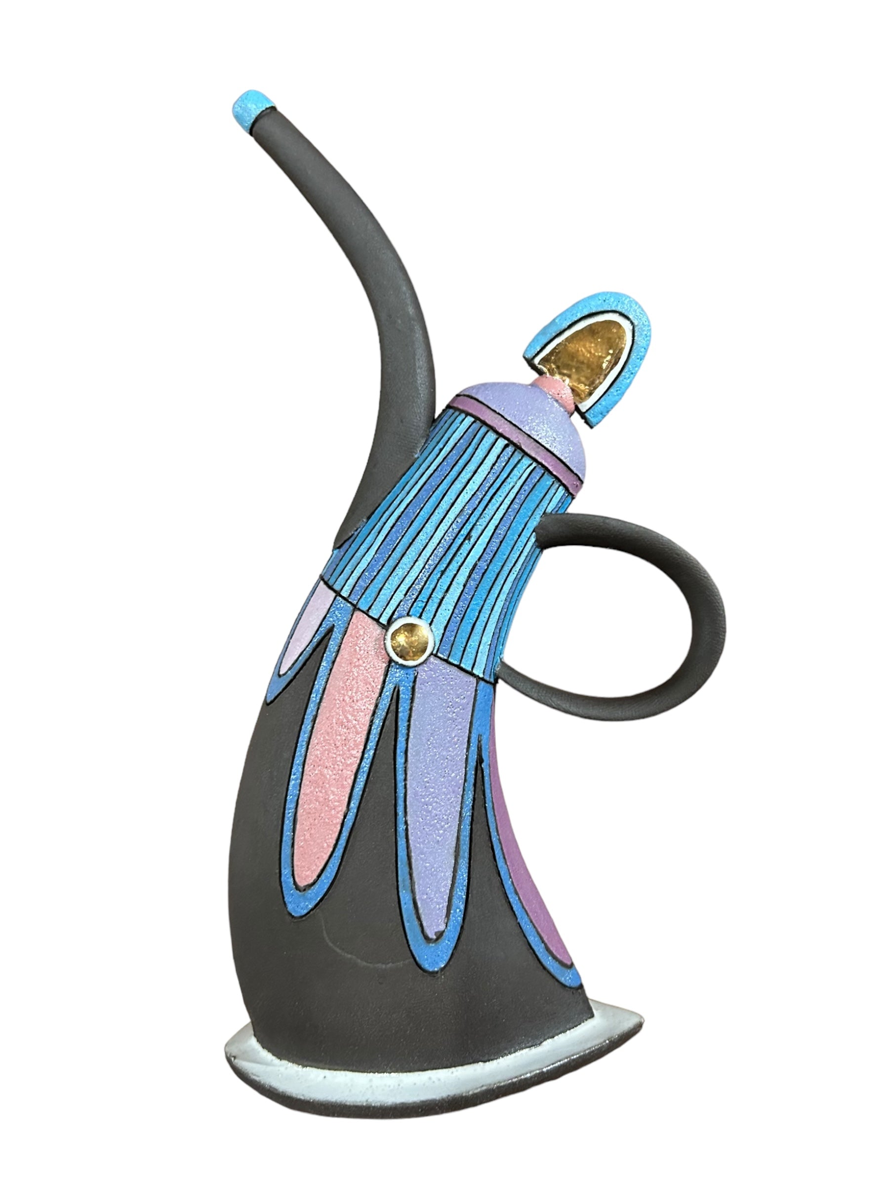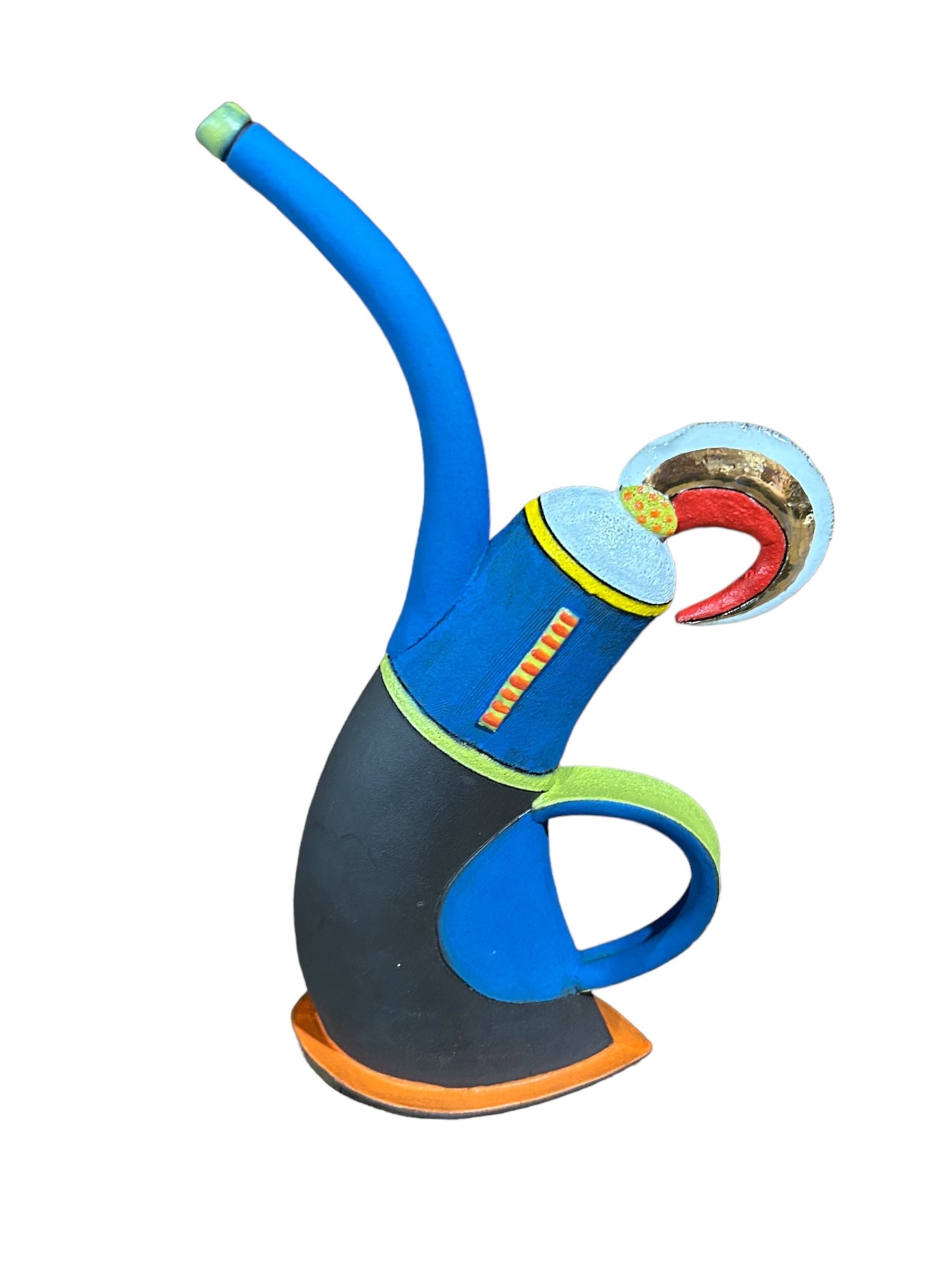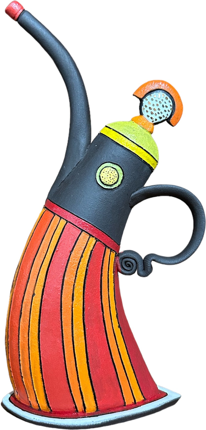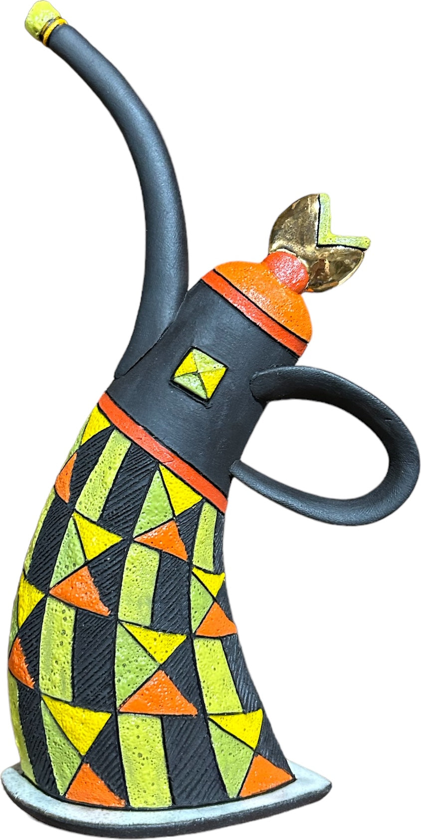 These whimsical caricatures of teapots were created by Hennie Meyer, an acclaimed Artist and ceramist.  They will bring a joyful spirit to your home, or are wonderful gifts to share with those who have a unique flair!  They are for decoration, and cannot pour actual tea - just in case you were fooled.  All are one of a kind, hand created, fired, and hand painted.