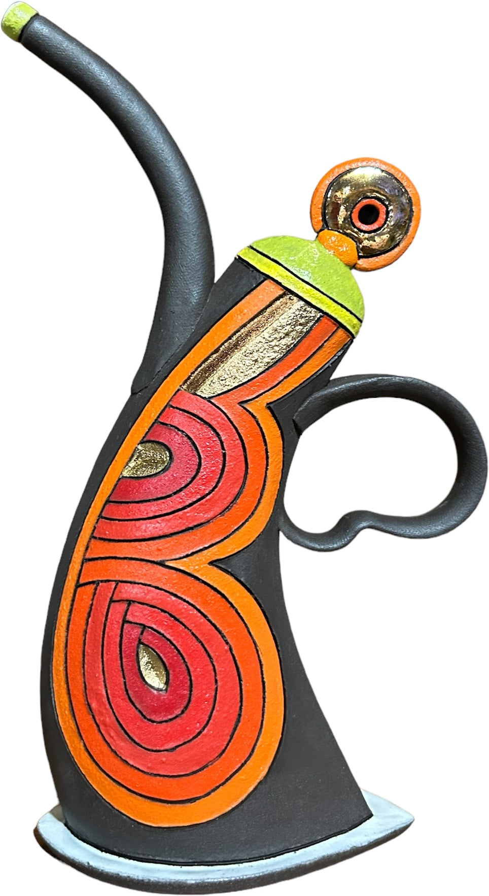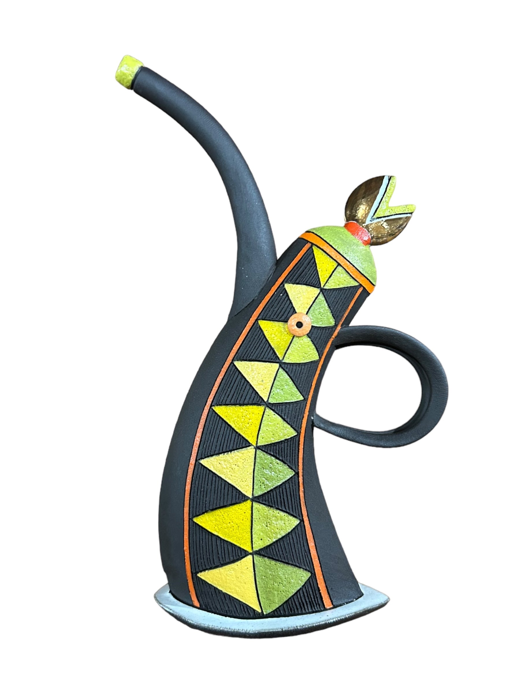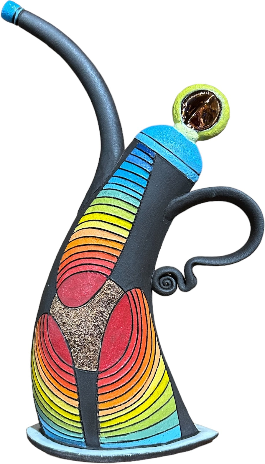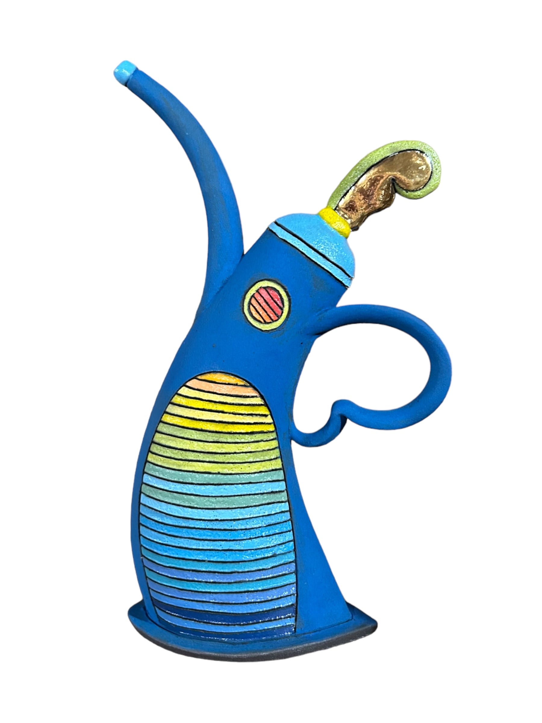 These whimsical caricatures of teapots were created by Hennie Meyer, an acclaimed Artist and ceramist.  They will bring a joyful spirit to your home, or are wonderful gifts to share with those who have a unique flair!  They are for decoration, and cannot pour actual tea - just in case you were fooled.  All are one of a kind, hand created, fired, and hand painted.