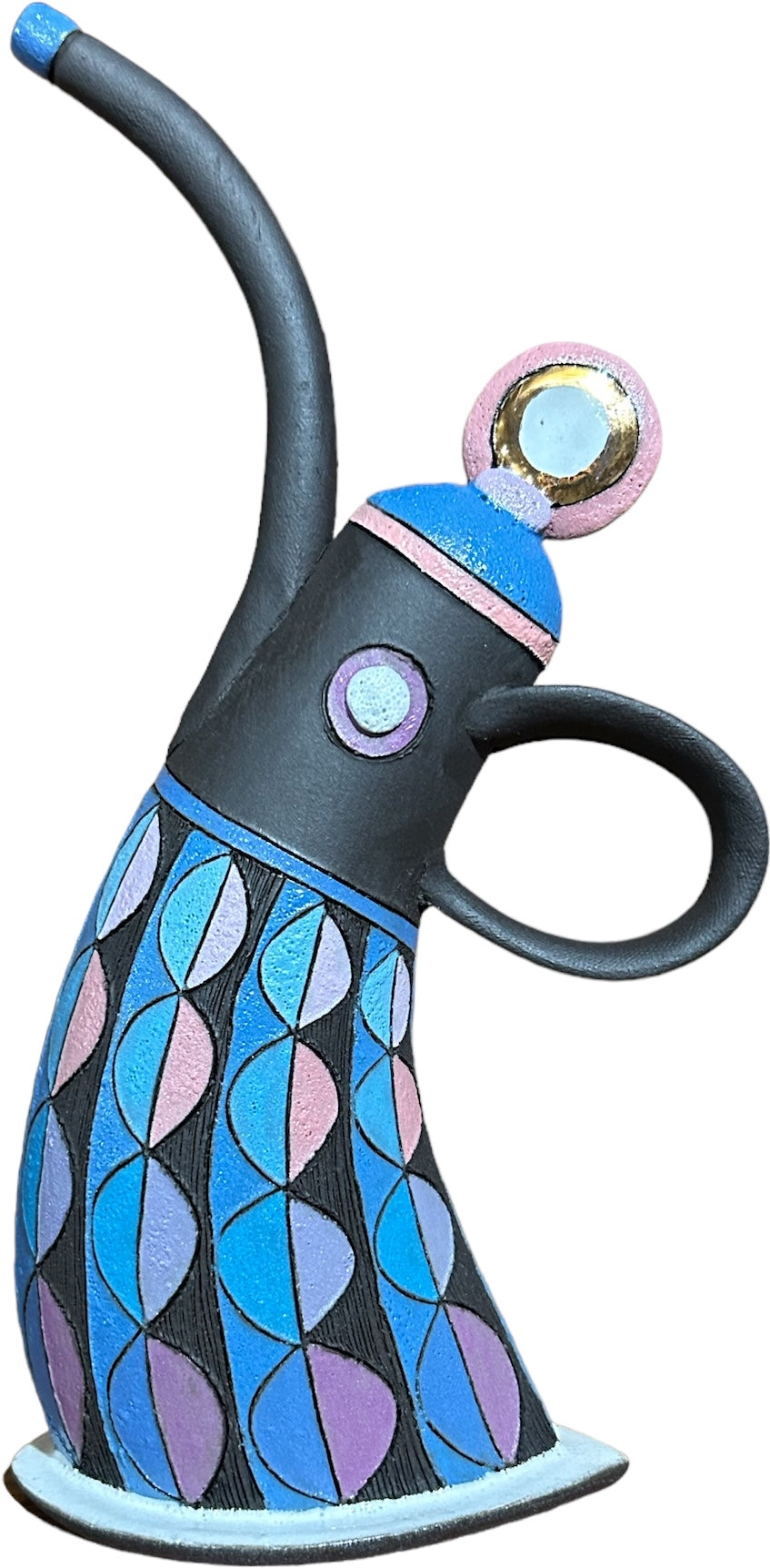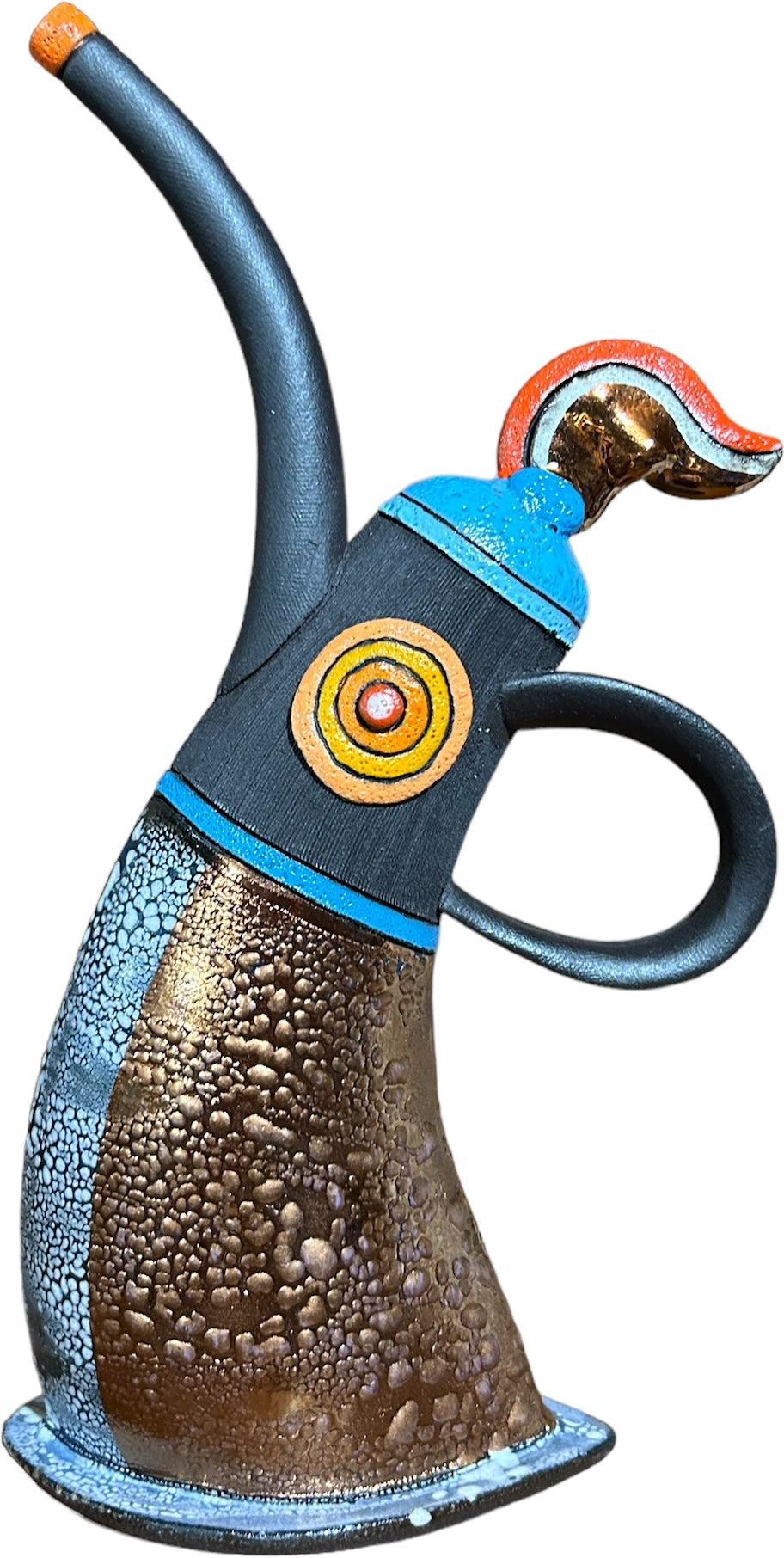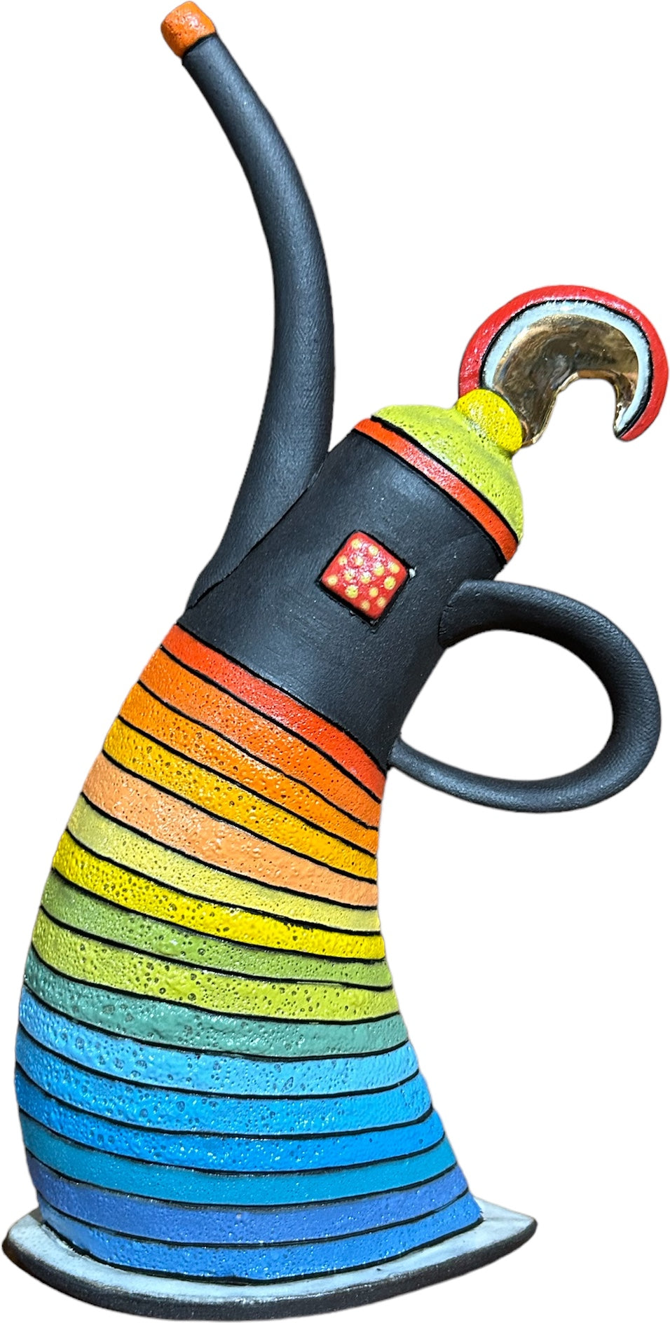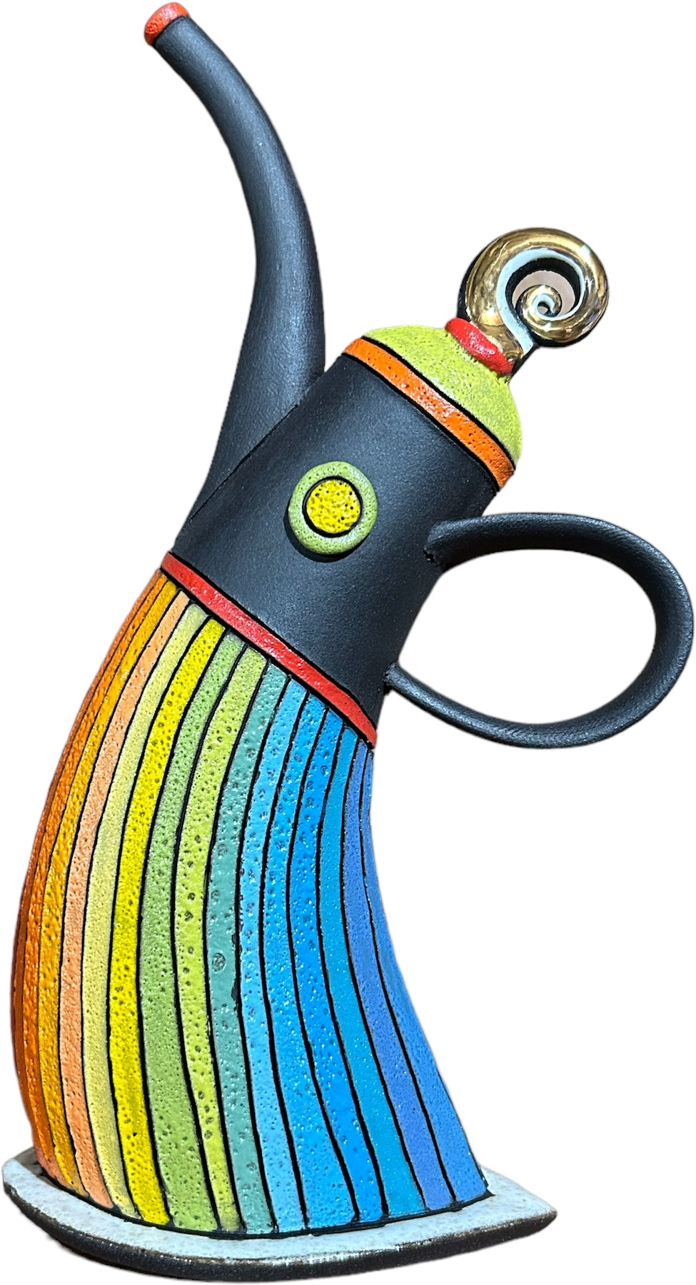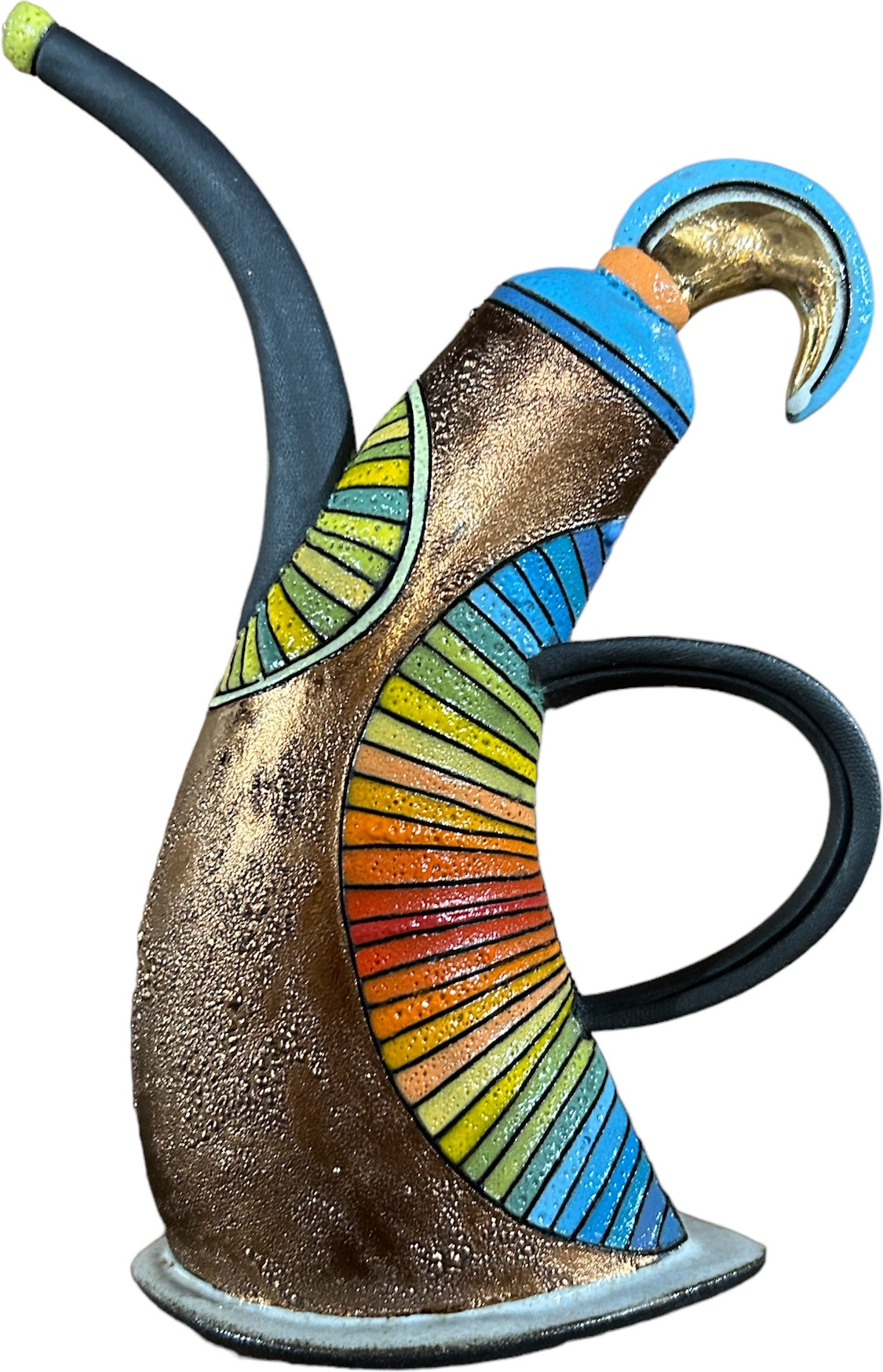 These whimsical caricatures of teapots were created by Hennie Meyer, an acclaimed Artist and ceramist.  They will bring a joyful spirit to your home, or are wonderful gifts to share with those who have a unique flair!  They are for decoration, and cannot pour actual tea - just in case you were fooled.  All are one of a kind, hand created, fired, and hand painted.