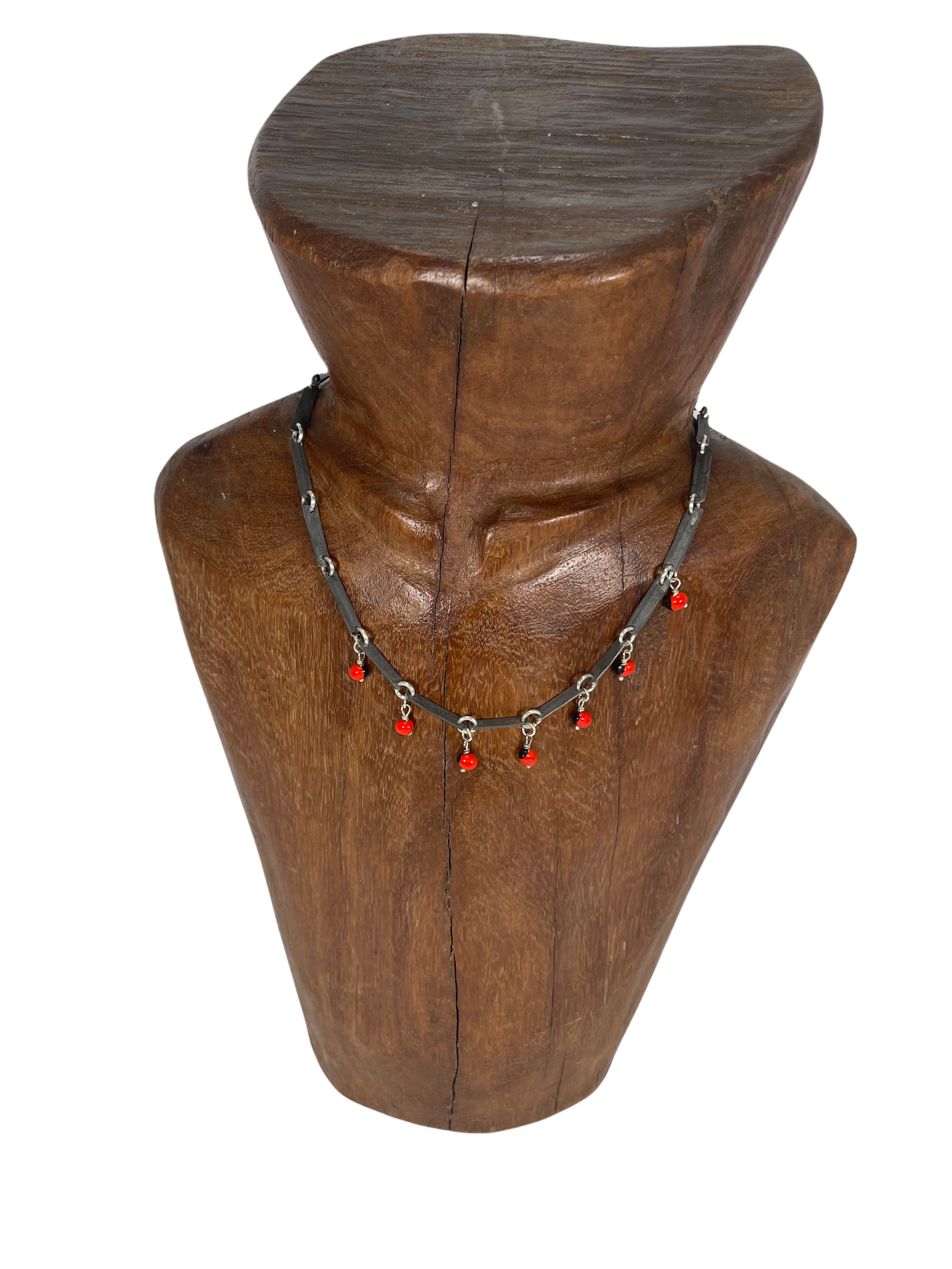 This necklace is made out of lucky beans that symbolize growth and endurance. Other materials used to complete this piece of jewelry are hammered snare wire and metal.