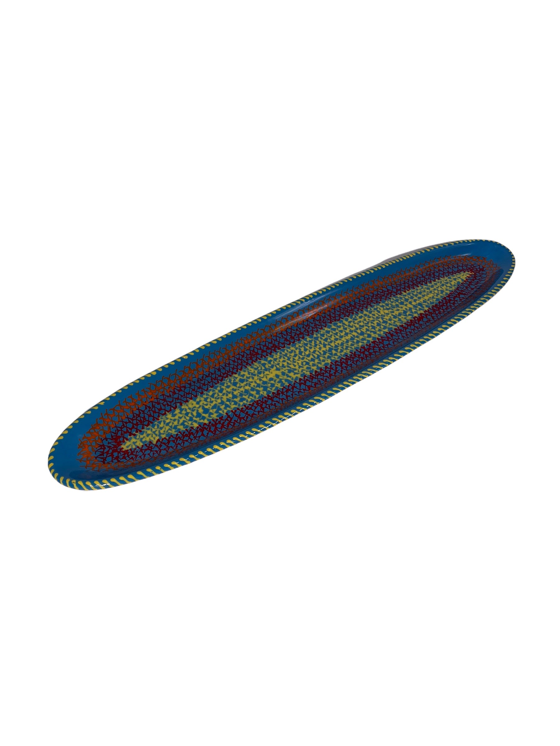 This beautiful Potterstitch Garlic Platter 19" is for those garlic lovers who want to serve their roasted garlic with flair. Potterstitch is an elegant marriage of ceramics with contemporary cross stitch, designed by artist Willemien de Villiers.  With a distinctive abstract African style using tactile, bead-like painting on hand-crafted ceramics, for which Potterswork is renowned, this piece was made by a master artisan. No two works are identical. Each piece is made by a master artisan. No two works are identical. The main color option is listed and a representative photo is shown. You will receive a similar piece. As all are one of a kind the main color option best describes the piece. All separate pieces coordinate with each other beautifully and can be mixed and matched to create a garden of colors on your table. If you desire to speak with one of our associates they can always pick and choose for you a color selection that will be unique, just like you!