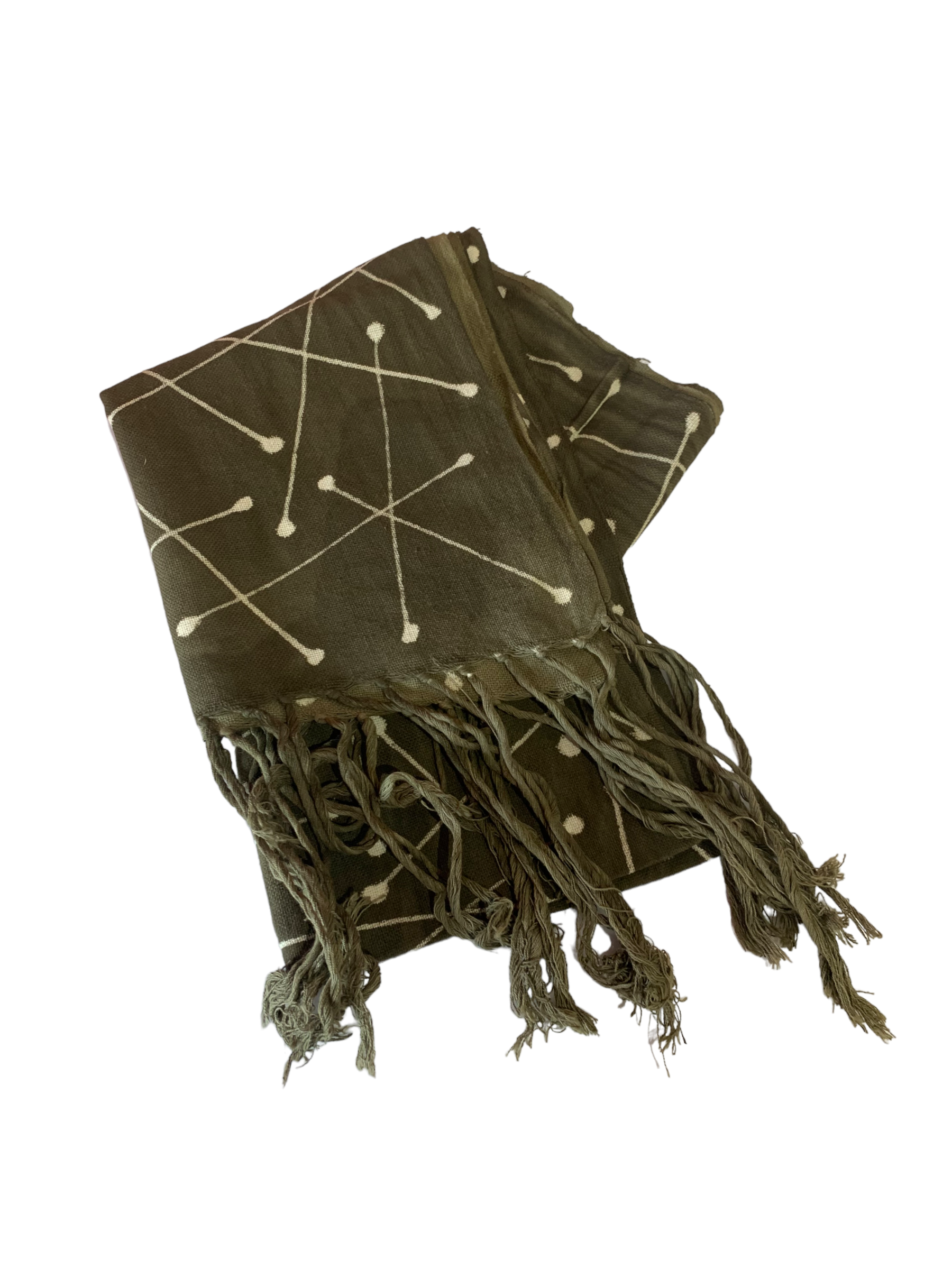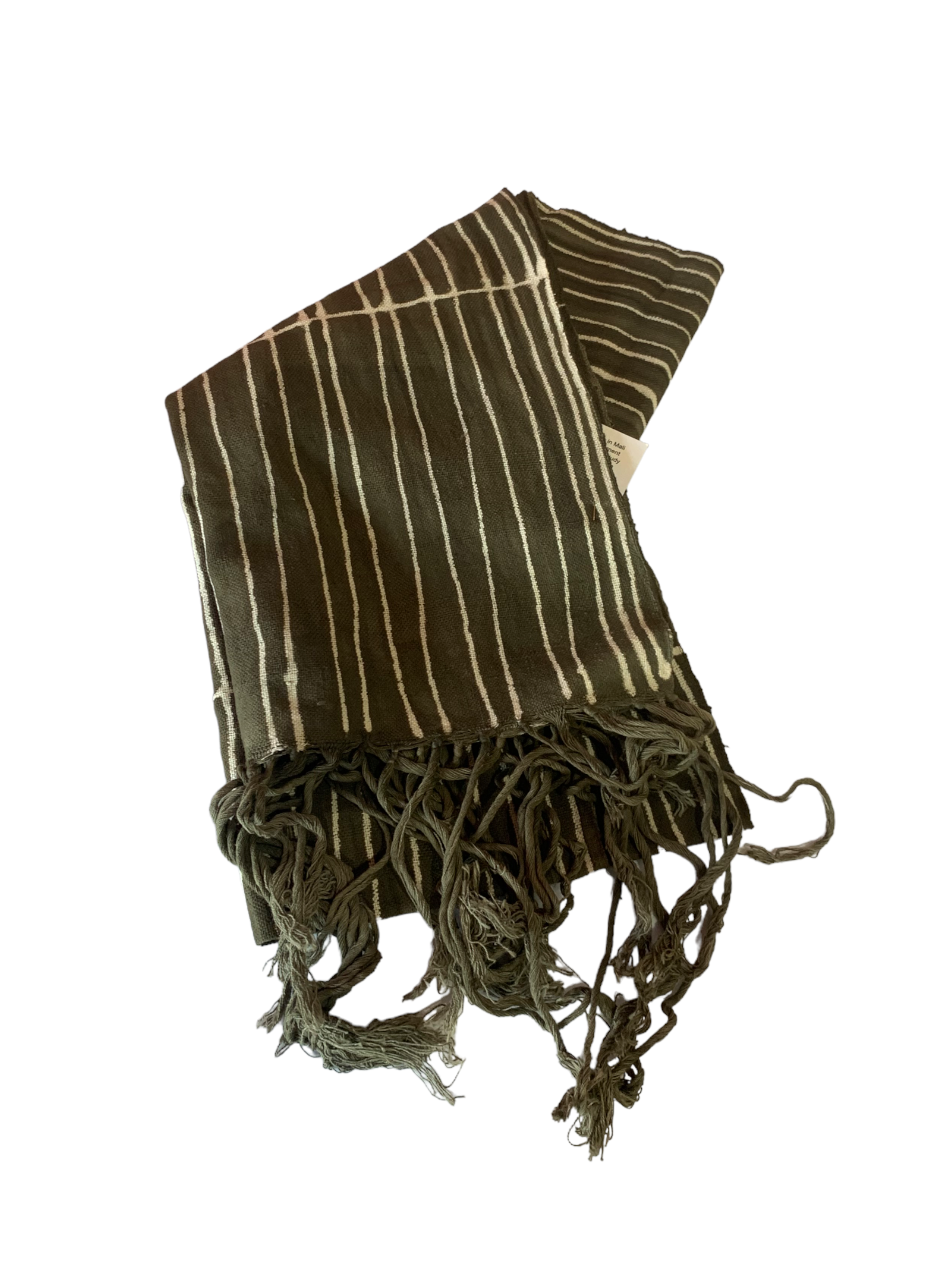 These multi use scarves or table runners are handmade by artists in Mali, who started a social enterprise to address the unemployment problem of young people who have not had the chance to attend school. It aims to give these young people training with local and technical knowledge. The goal of this work is to provide people with a sense of responsibility, social value, personal commitment, and solidarity in compliance with traditional African societies. All scarves are 100% organic cotton and hand dyed.