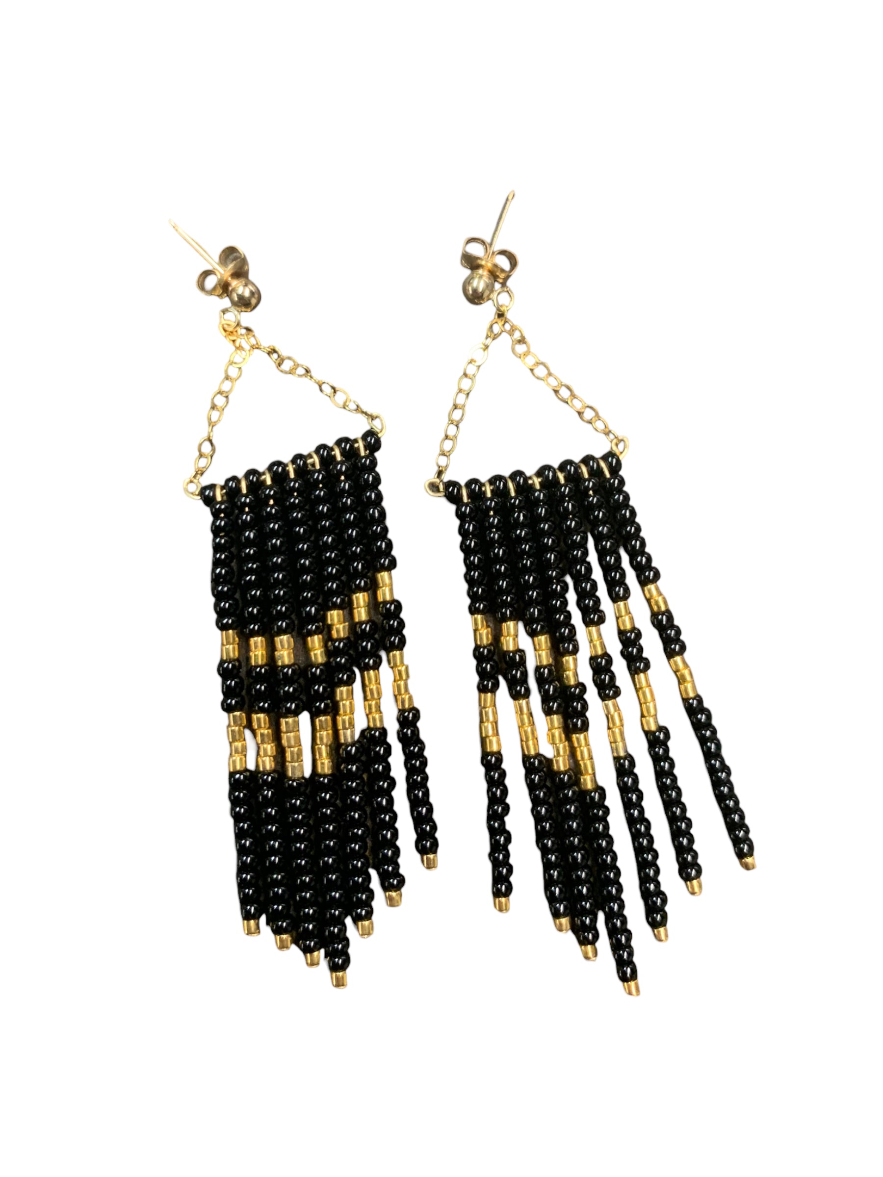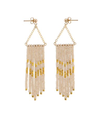 Made with 7x 14K gold-filled bars suspended from 14K gold-filled chain and beaded with high quality glass beads and 24K gold-plated glass beads. Secured with a 14K gold-filled stud. Length: 2.75”.