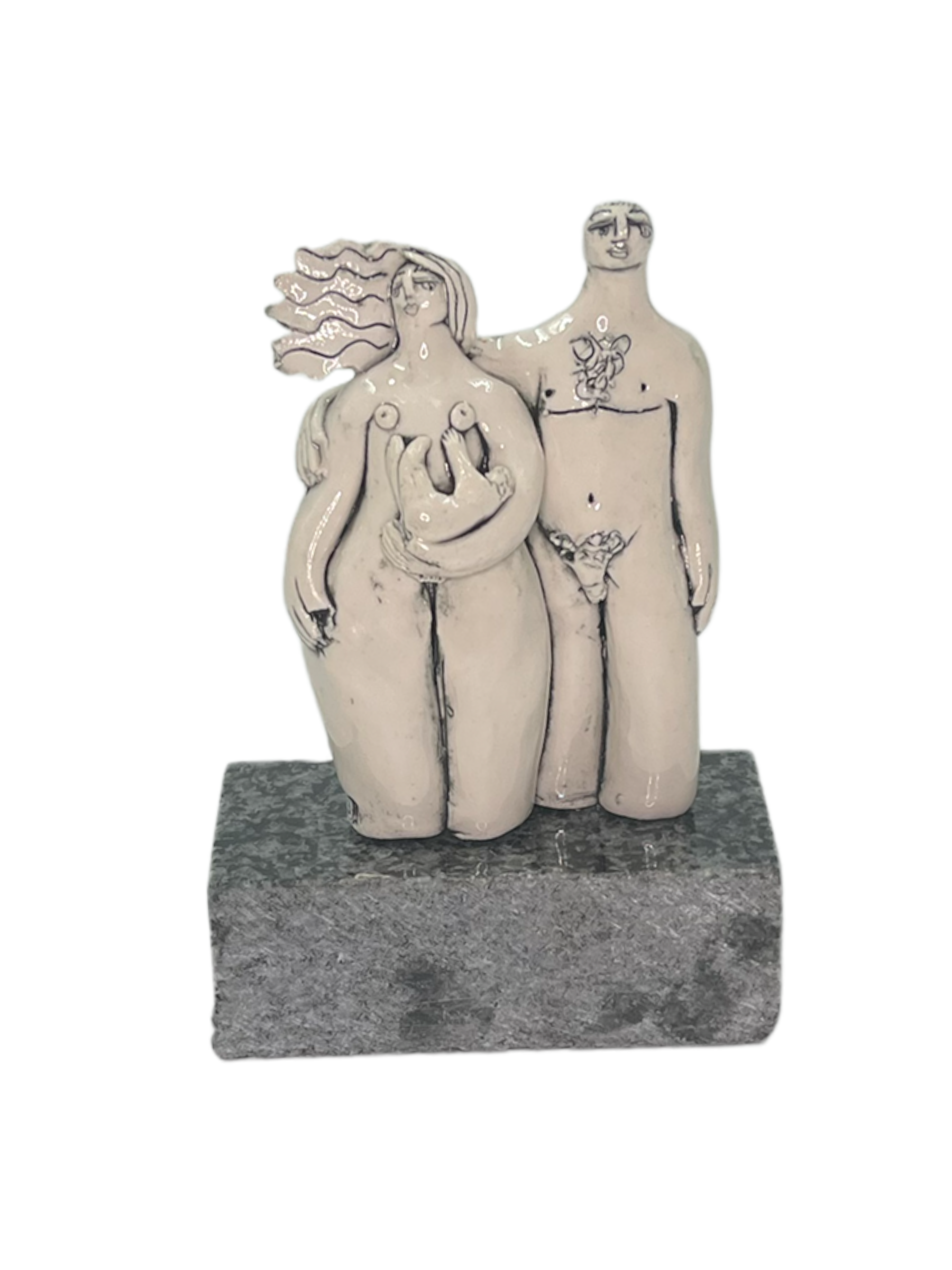 This “Celebratory Sculpture” of Adam, Eve and Child in clay created by renowned ceramicist, Tania Babb, has a silky and earthy porcelain, matte finish which absorbs the light instead of reflecting it.  This makes her piece “clean and quiet,” as Babb intended. Every single ceramic work is one-of-a-kind and handmade with no two quite alike.