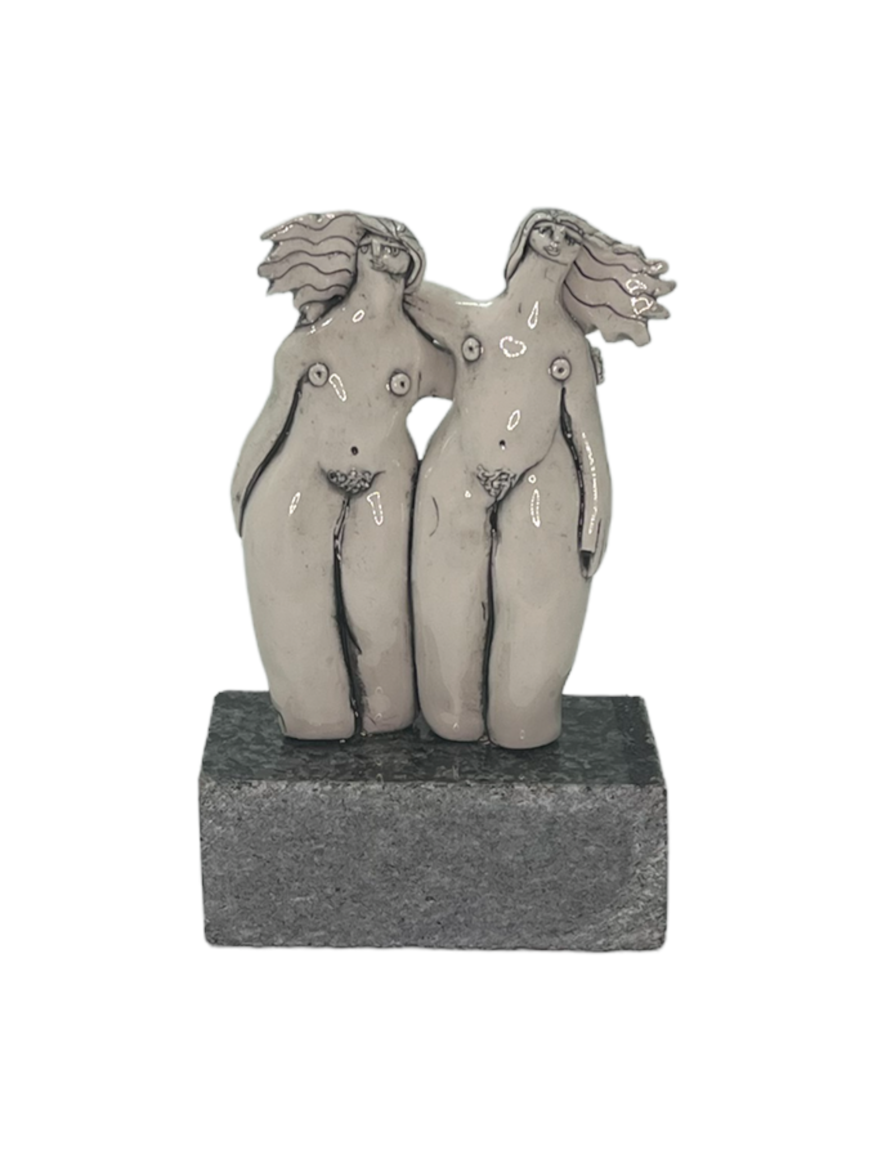 This “Celebratory Sculpture” of Madam and Eve in clay created by renowned ceramicist, Tania Babb, has a silky and earthy porcelain, matte finish which absorbs the light instead of reflecting it. This makes her piece “clean and quiet,” as Babb intended. Every single ceramic work is one-of-a-kind and handmade with no two quite alike.