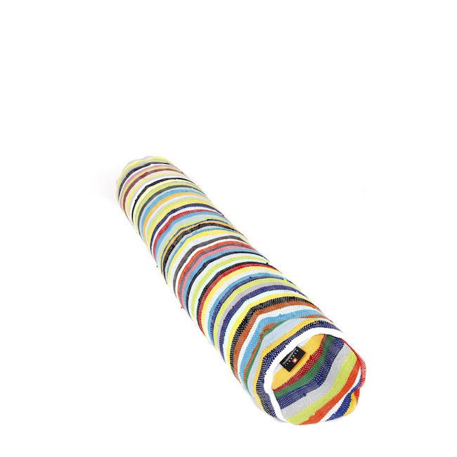 Ashanti’s Hand Loomed Bolster Pillow is so versatile! It can be used as a lounge sized body and bed pillow to provide you with support for those lazy afternoons you want to lie on your side and watch clouds float by... Or you can use this awesome cushion either as a bolster for your back in bed, on the couch, or with a Bori Bori Bean Bag. All handmade. Crafted with African classical weaving techniques from recycling T-shirt material that would otherwise be discarded into landfills. Each T-shirt is hand-stripped, dyed by hand, re-woven and then crafted into this iconic, colorful fabric. Approx. Size: 53” Long x 8" Diameter
