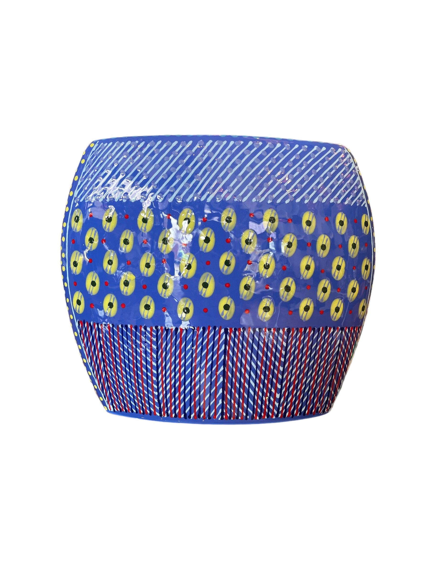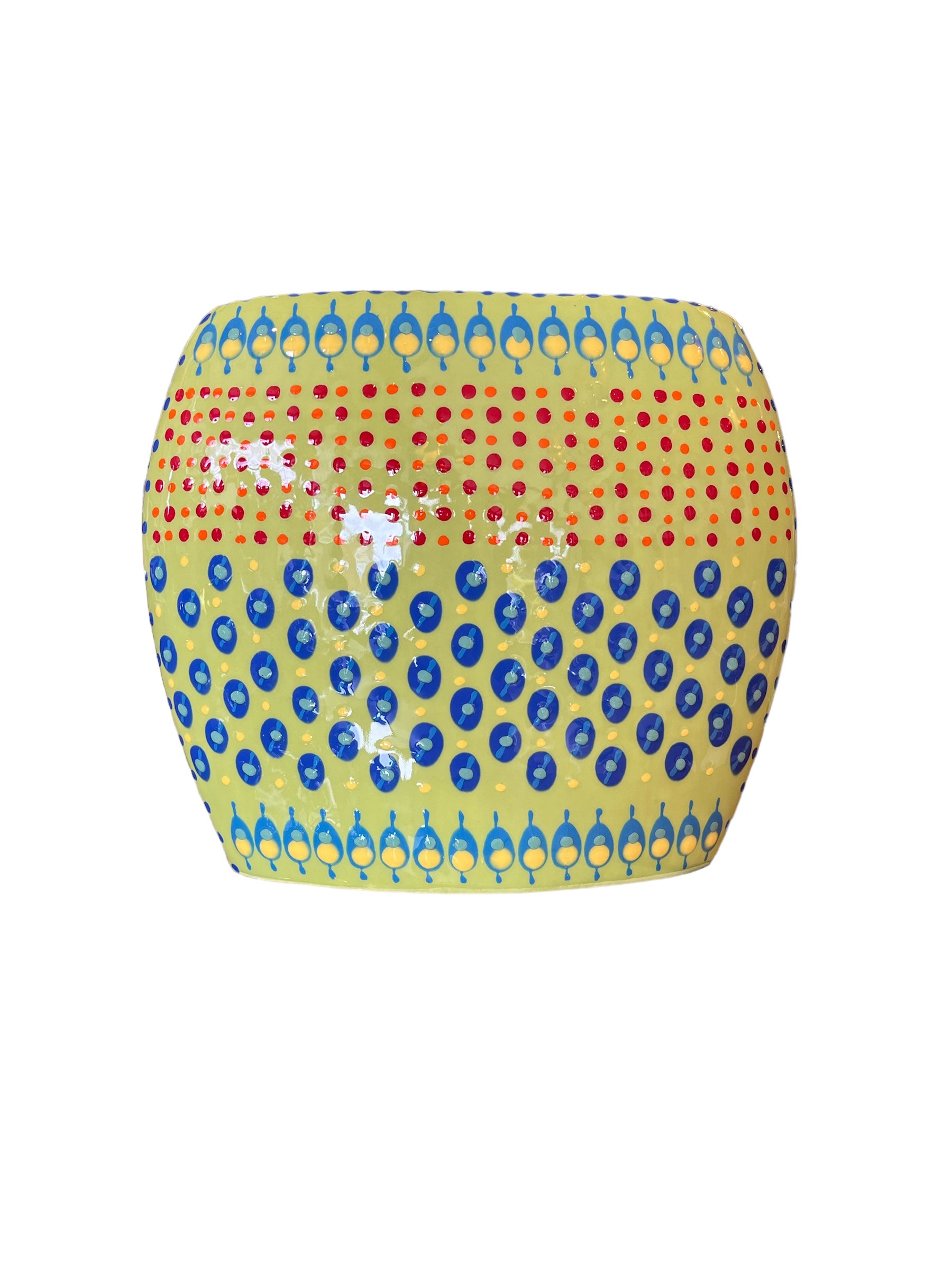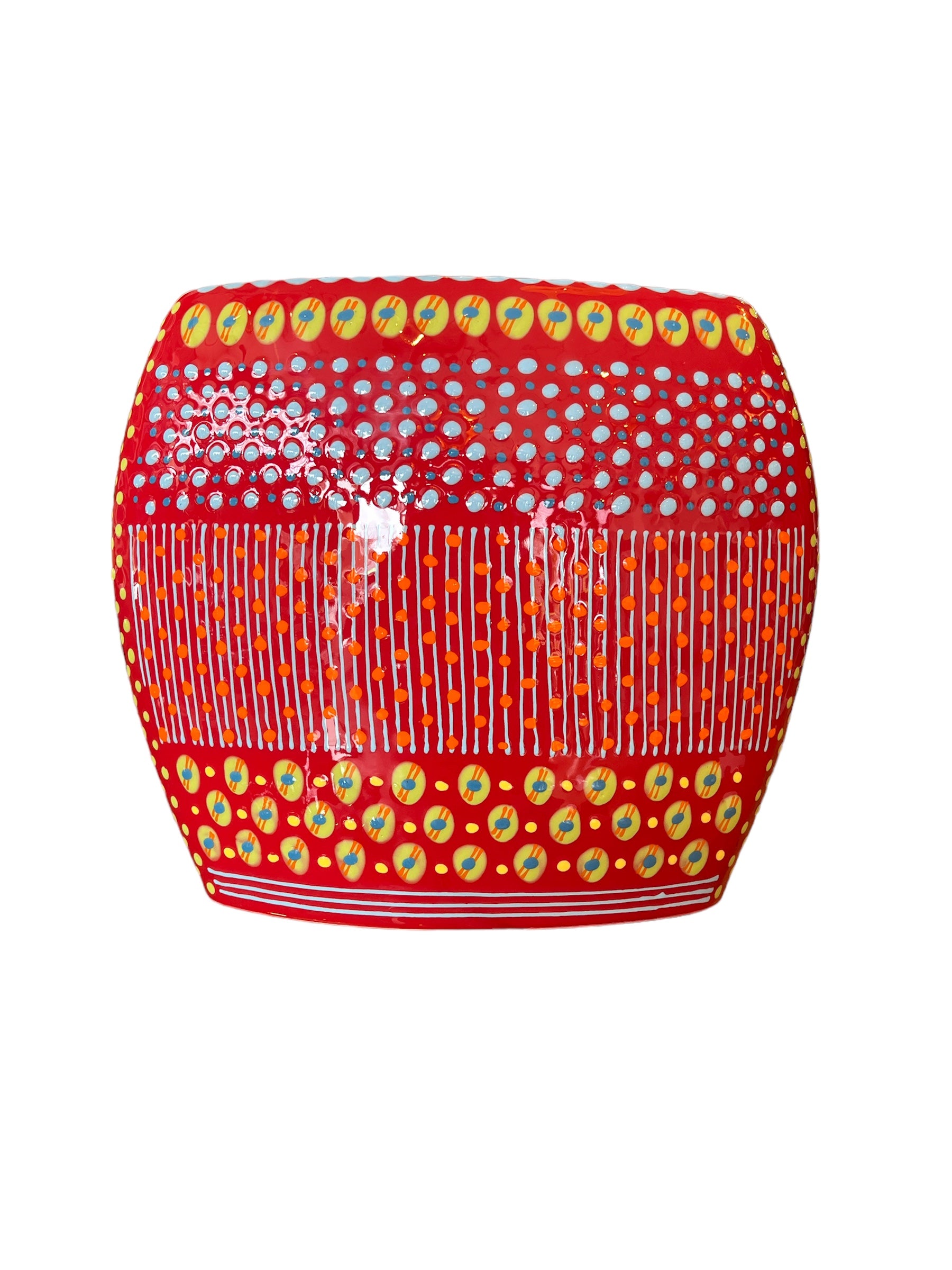The Large Flat Vase is 9" tall and 10" wide. With contemporary Xhosa Tribal designs and smooth lines it's unique shape is lovely to behold. With a distinctive abstract African style using tactile, bead-like painting on hand-crafted ceramics, for which Potterswork is renowned, this piece was made by a master artisan. No two works are identical. Each piece is made by a master artisan. No two works are identical. The main color option is listed and a representative photo is shown. You will receive a similar piece. As all are one of a kind the main color option best describes the piece. All separate pieces coordinate with each other beautifully and can be mixed and matched to create a garden of colors on your table. If you desire to speak with one of our associates they can always pick and choose for you a color selection that will be unique, just like you!