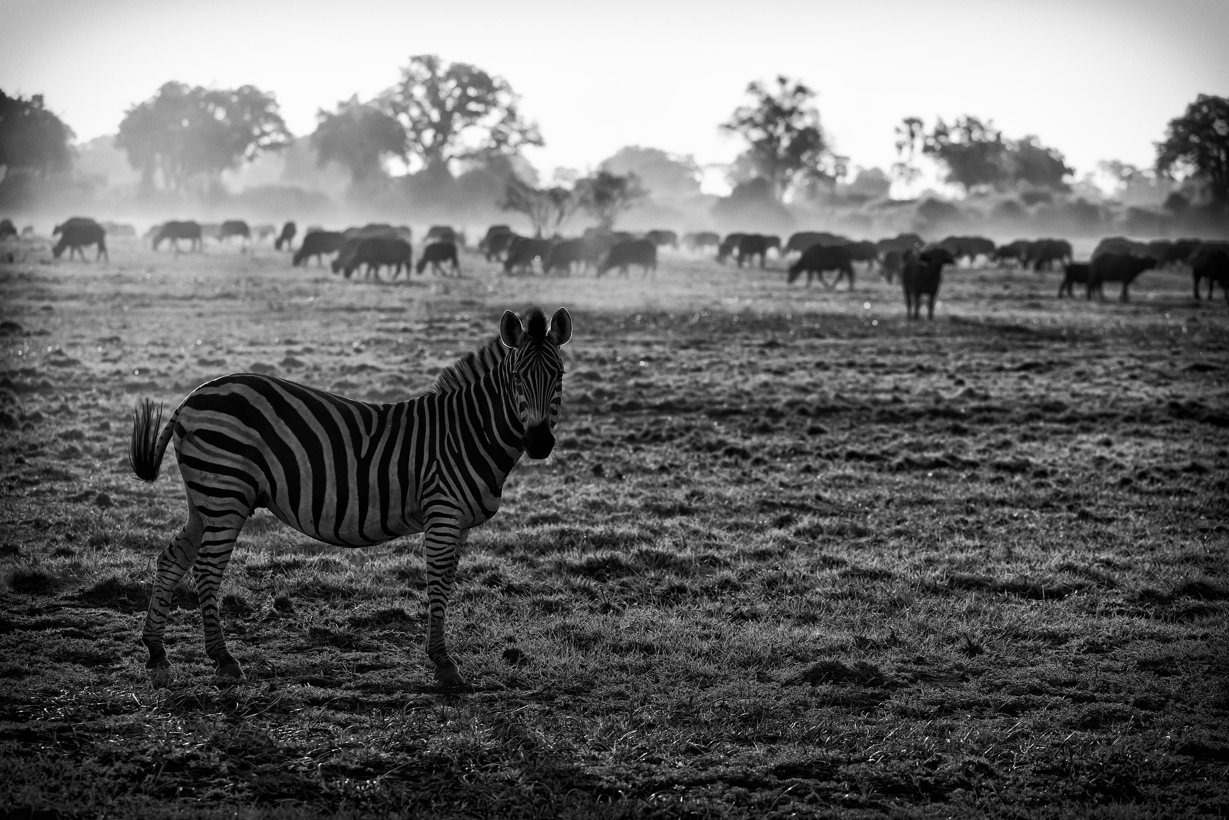 As the golden light of a winter sunset fades, a lone Burchell’s zebra stands in quiet contrast against the vast herd of grazing buffalo behind him. Dust lingers in the air, illuminated by the last warmth of the day, as he turns to meet my gaze—an emblem of the untamed beauty of Africa. A fleeting yet timeless moment, capturing the harmony of wildlife that roams free in this extraordinary landscape.