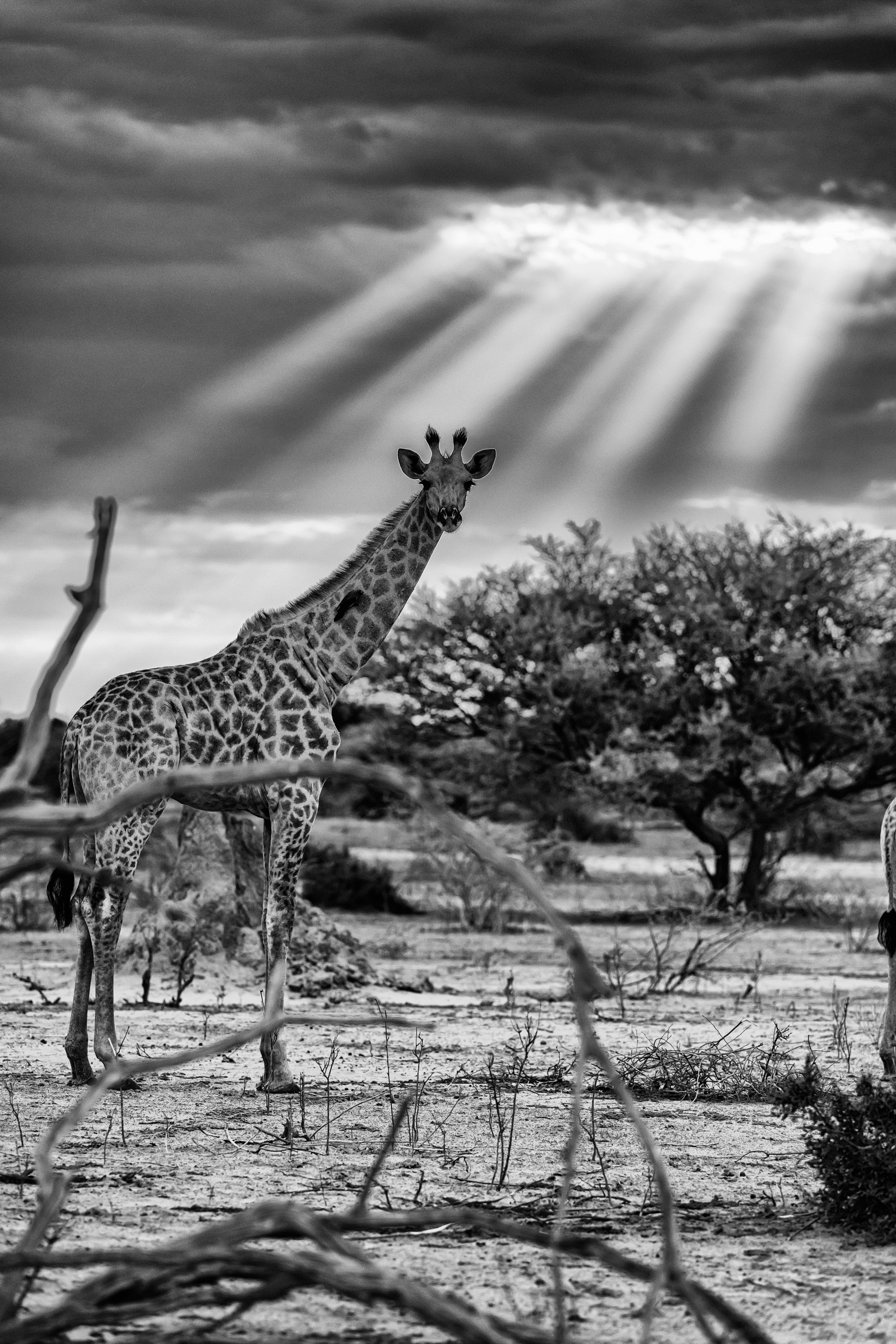 Bathed in golden light, a solitary southern giraffe gazes back with quiet curiosity, framed by the raw beauty of Botswana’s winter landscape. The interplay of shadow and light creates a natural dome around this elegant giant, as dormant trees and weathered logs rest in the foreground, adding depth and texture to the scene. A fleeting moment of stillness in the ever-changing wilderness.