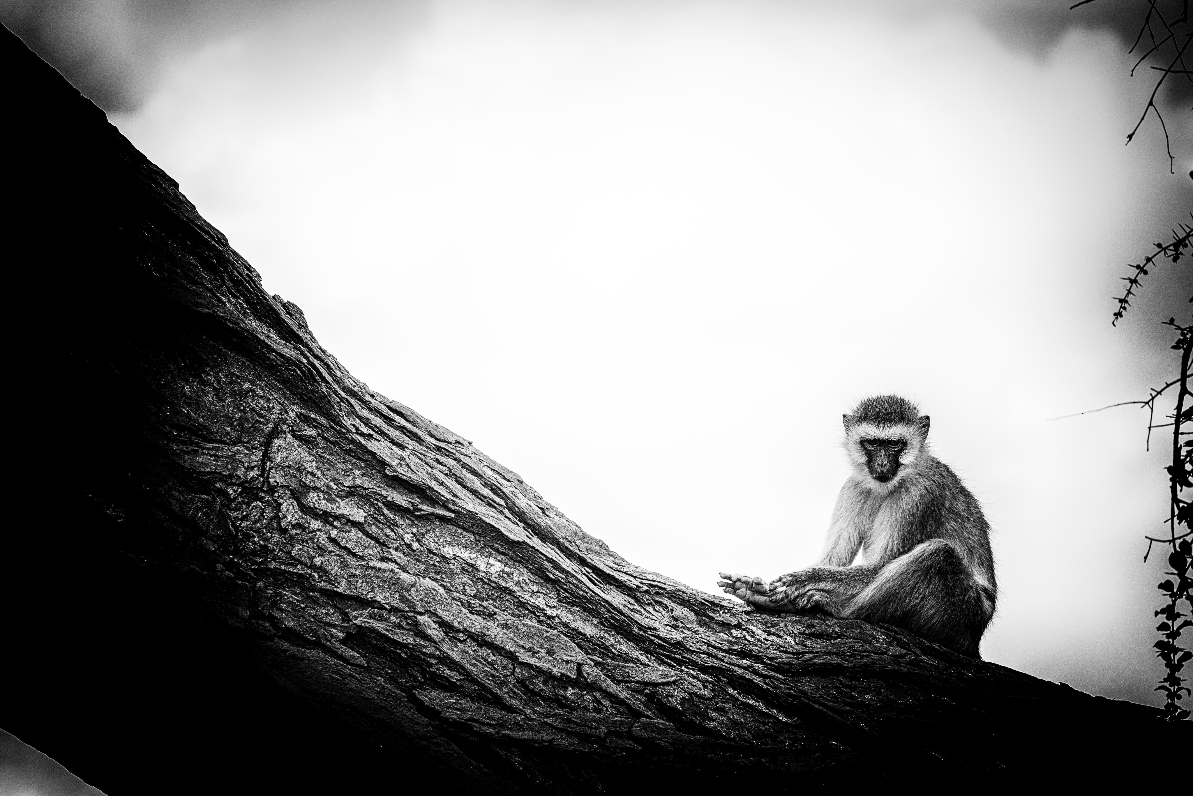 Perched gracefully in the crook of a towering tree, a young vervet monkey sits with quiet contemplation, his hands resting on his feet as he meets my gaze. Against a stark white sky, the contrast of dark wood and soft fur draws us into his world—one of instinct, curiosity, and the simple beauty of living in the moment. While we ponder the complexities of conservation, he remains blissfully unaware, a reminder of the purity of the present—a lesson from the wild to us all.