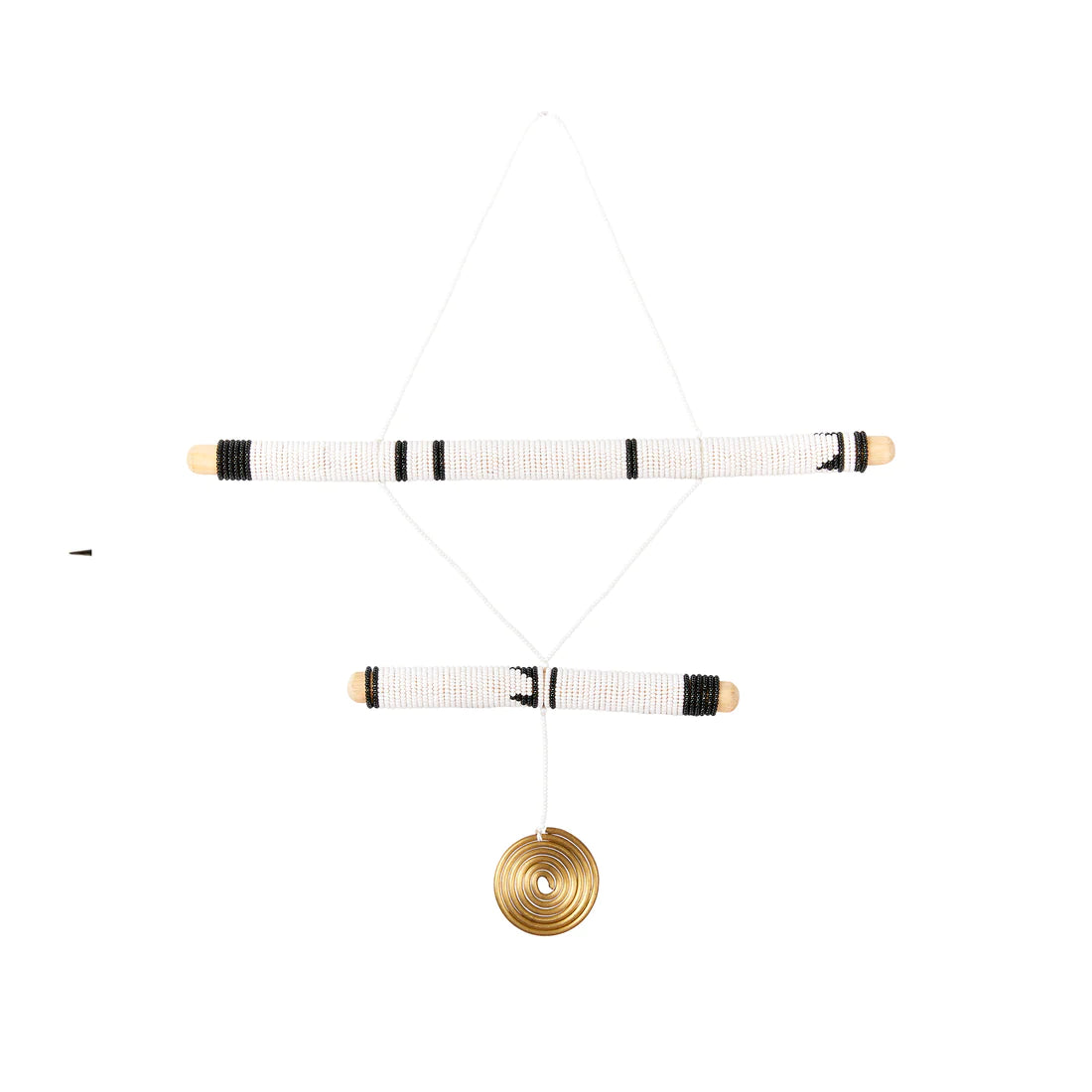 Maasai walking sticks are cut into small wooden sticks to form the base of this hanging mobile. Glass beads are woven together with thread made from recycled grain sacks to wrap the sticks. Finished with a traditional Maasai brass coil. Suspends by a beaded string.